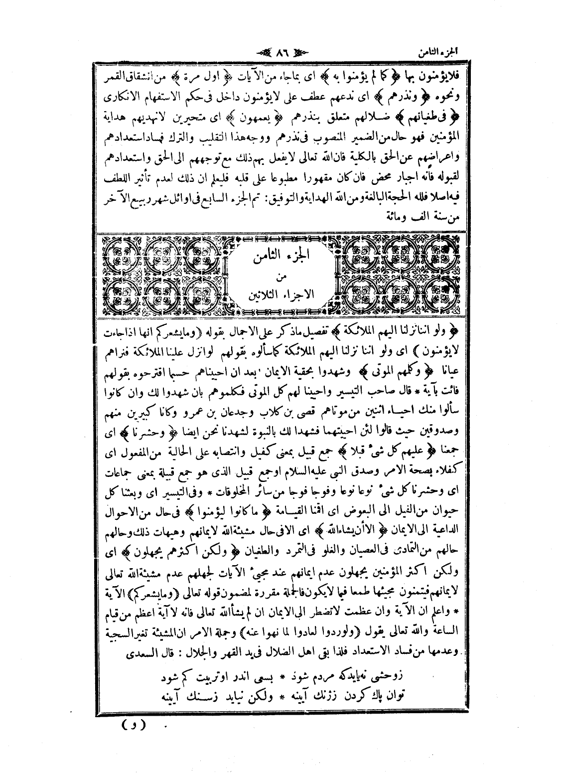 فلا يؤمنون بها كَما لَمْ يُؤْمِنُوا بِهِ اى بما جاء من الآيات أَوَّلَ مَرَّةٍ من انشقاق القمر ونحوه وَنَذَرُهُمْ اى ندعهم عطف على لا يؤمنون داخل فى حكم الاستفهام الإنكاري فِي طُغْيانِهِمْ ضلالهم متعلق بنذرهم يَعْمَهُونَ اى متحيرين لا نهديهم هداية المؤمنين فهو حال من الضمير المنصوب فى نذرهم ووجه هذا التقليب والترك فساد استعدادهم واعراضهم عن الحق بالكلية فان الله تعالى لا يفعل بهم ذلك مع توجههم الى الحق واستعدادهم لقبوله فانه إجبار محض فان كان مقهورا مطبوعا على قلبه فليعلم ان ذلك لعدم تأثير اللطف فيه أصلا فلله الحجة البالغة ومن الله الهداية والتوفيق: تم الجزء السابع فى أوائل شهر ربيع الآخر من سنة الف ومائة الجزء الثامن من الاجزاء الثلاثين وَلَوْ أَنَّنا نَزَّلْنا إِلَيْهِمُ الْمَلائِكَةَ تفصيل ما ذكر على الإجمال بقوله وَما يُشْعِرُكُمْ أَنَّها إِذا جاءَتْ لا يُؤْمِنُونَ اى ولو اننا نزلنا إليهم الملائكة كما سألوه بقولهم لو انزل علينا الملائكة فنراهم عيانا وَكَلَّمَهُمُ الْمَوْتى وشهدوا بحقية الايمان بعد ان احييناهم حسبما اقترحوه بقولهم فائت بآية قال صاحب التيسير وأحيينا لهم كل الموتى فكلموهم بان شهدوا لك وان كانوا سألوا منك احياء اثنين من موتاهم قصى بن كلاب وجدعان بن عمرو وكانا كبيرين منهم وصدوقين حيث قالوا لئن أحييتهما فشهدا لك بالنبوة لشهدنا نحن ايضا وَحَشَرْنا اى جمعنا عَلَيْهِمْ كُلَّ شَيْءٍ قُبُلًا جمع قبيل بمعنى كفيل وانتصابه على الحالية من المفعول اى كفلاء بصحة الأمر وصدق النبي عليه السلام او جمع قبيل الذي هو جمع قبيلة بمعنى جماعات اى وحشرنا كل شىء نوعا نوعا وفوجا فوجا من سائر المخلوقات وفى التيسير اى وبعثنا كل حيوان من الفيل الى البعوض اى أقمنا القيامة ما كانُوا لِيُؤْمِنُوا فى حال من الأحوال الداعية الى الايمان إِلَّا أَنْ يَشاءَ اللَّهُ اى الا فى حال مشيئة الله لايمانهم وهيهات ذلك وحالهم حالهم من التمادي فى العصيان والغلو فى التمرد والطغيان وَلكِنَّ أَكْثَرَهُمْ يَجْهَلُونَ اى ولكن اكثر المؤمنين يجهلون عدم ايمانهم عند مجيىء الآيات لجهلهم عدم مشيئة الله تعالى لايمانهم فيتمنون مجيئها طمعا فيما لا يكون فالجملة مقررة لمضمون قوله تعالى وَما يُشْعِرُكُمْ الآية واعلم ان الآية وان عظمت لا تضطر الى الايمان ان لم يشأ الله تعالى فانه لا آية أعظم من قيام الساعة والله تعالى يقول وَلَوْ رُدُّوا لَعادُوا لِما نُهُوا عَنْهُ وجملة الأمر ان المشيئة تغير السجية وعدمها من فساد الاستعداد فلذا بقي اهل الضلال فى يد القهر والجلال: قال السعدي