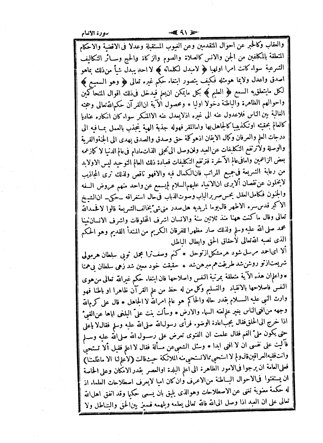 هو كلمة حق وصدق والصدق يهدى الى الجنة والقربة والوصلة ولا ترتفع التكليفات عن العبد وان وصل الى تجلى الذات مادام فى عالم الدنيا لا كما زعمه بعض الزاعمين واما فى عالم الآخرة فترتفع التكليفات فعبادة ذلك العالم التوحيد ليس الا ولا بد من رعاية الشريعة فى جميع المراتب فان الكمال فيه والا فهو ناقص ولذلك ترى المجاذيب لا يخلون عن نقصان ألا يرى ان الأنبياء عليهم السلام لم يسمع عن واحد منهم عروض السفه والجنون فكامل العقل يحس صرير الباب وصوت الذباب فى حال استغراقه- حكى- ان الشيخ الأكبر قدس سره الأطهر قال يوما لمريديه هل صدر منى شىء يخالف الشريعة قالوا لا فحمد الله تعالى وقال ما كنت هاهنا منذ ثلاثين سنة والإنسان اشرف المخلوقات واشرف الإنسان نبينا محمد صلى الله عليه وسلم ولذلك صار مظهرا للفرقان الكريم من المبتدأ القديم وهو الحكم الذي نصبه الله تعالى لاحقاق الحق وابطال الباطل