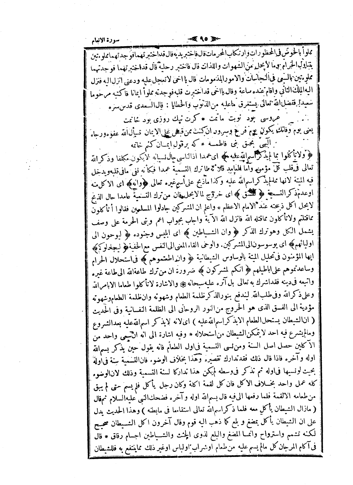 وَلا تَأْكُلُوا مِمَّا لَمْ يُذْكَرِ اسْمُ اللَّهِ عَلَيْهِ اى عمدا إذ الناسي حال نسيانه لا يكون مكلفا وذكر الله تعالى فى قلب كل مؤمن واما العامد فلأنه لما ترك التسمية عمدا فكأنه نفى ما فى قلبه ويدخل فيه الميتة لانها مما لم يذكر اسم الله عليه وكذا ما ذبح على اسم غيره تعالى وَإِنَّهُ اى الاكل منه او عدم ذكر التسمية لَفِسْقٌ اى خروج لما لا يحل فان من ترك التسمية عامدا حال الذبح لا يحل أكل ذبيحته عند الامام الأعظم واعلم ان المشركين جادلوا المسلمين فقالوا أتأكلون مما قتلتم ولا تأكلون مما قتله الله فانزل الله الآية وأجاب بجواب أعم ونبى الحرمة على وصف يشمل الكل وهو ترك الذكر وَإِنَّ الشَّياطِينَ اى إبليس وجنوده لَيُوحُونَ إِلى أَوْلِيائِهِمْ اى يوسوسون الى المشركين. والوحى إلقاء المعنى الى النفس مع الخفية لِيُجادِلُوكُمْ ايها المؤمنون فى تحليل الميتة بالوساوس الشيطانية وَإِنْ أَطَعْتُمُوهُمْ فى استحلال الحرام وساعدتموهم على أباطيلهم إِنَّكُمْ لَمُشْرِكُونَ ضرورة ان من ترك طاعة الله الى طاعة غيره واتبعه فى دينه فقد أشرك به تعالى بل آثره عليه سبحانه والاشارة لا تأكلوا طعاما الا بامر الله وعلى ذكر الله وفى طلب الله ليندفع بنور الذكر ظلمة الطعام وشهوته وان ظلمة الطعام وشهوته مؤدية الى الفسق الذي هو الخروج من النور الروحاني الى الظلمة النفسانية وفى الحديث (ان الشيطان يستحل الطعام الا بذكر اسم الله عليه) اى لانه لا يذكر اسم الله عليه بعد الشروع وما لم يشرع فيه أحد لا يتمكن الشيطان من استحلاله وفيه اشارة الى انه ان سمى واحد من الآكلين حصل اصل السنة ومن نسى التسمية فى أول الطعام فانه يقول حين يذكر بسم الله اوله وآخره فاذا قال ذلك فقد تدارك تقصيره وهذا بخلاف الوضوء فان التسمية سنة فى اوله بحيث لو نسيها فى اوله ثم تذكر فى وسطه لم يكن هذا تداركا لسنة التسمية وذلك لان الوضوء كله عمل واحد بخلاف الاكل فان كل لقمة أكلة وكان رجل يأكل فلم يسم حتى لم يبق من طعامه الا لقمة فلما رفعها الى فيه قال بسم الله اوله وآخره فضحك النبي عليه السلام ثم قال (مازال الشيطان يأكل معه فلما ذكر اسم الله تعالى استقاء ما فى ما بطنه) وهذا الحديث يدل على ان الشيطان يأكل بمضغ وبلع كما ذهب اليه قوم وقال آخرون أكل الشيطان صحيح لكنه تشمم واسترواح وانما المضغ والبلع لذوى الجثث والشياطين أجسام رقاق قال فى آكام المرجان كل ما لم يسم عليه من طعام او شراب او لباس او غير ذلك مما ينتفع به فللشيطان
