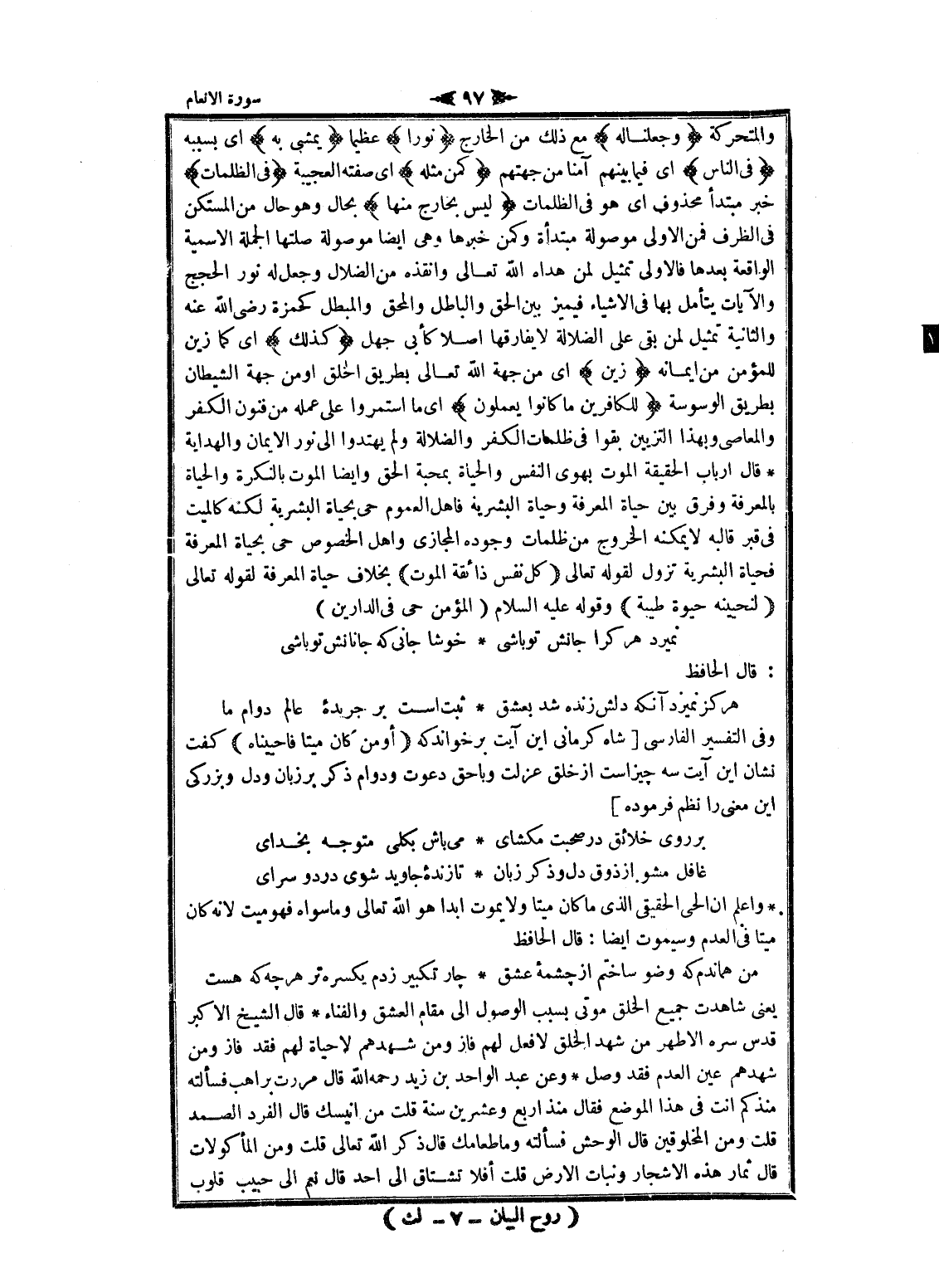 وفى التفسير الفارسي [شاه كرمانى اين آيت بر خواند كه أَوَمَنْ كانَ مَيْتاً فَأَحْيَيْناهُ كفت نشان اين آيت سه چيز است از خلق عزلت وبا حق دعوت ودوام ذكر بر زبان ودل وبزركى اين معنى را نظم فرموده]
