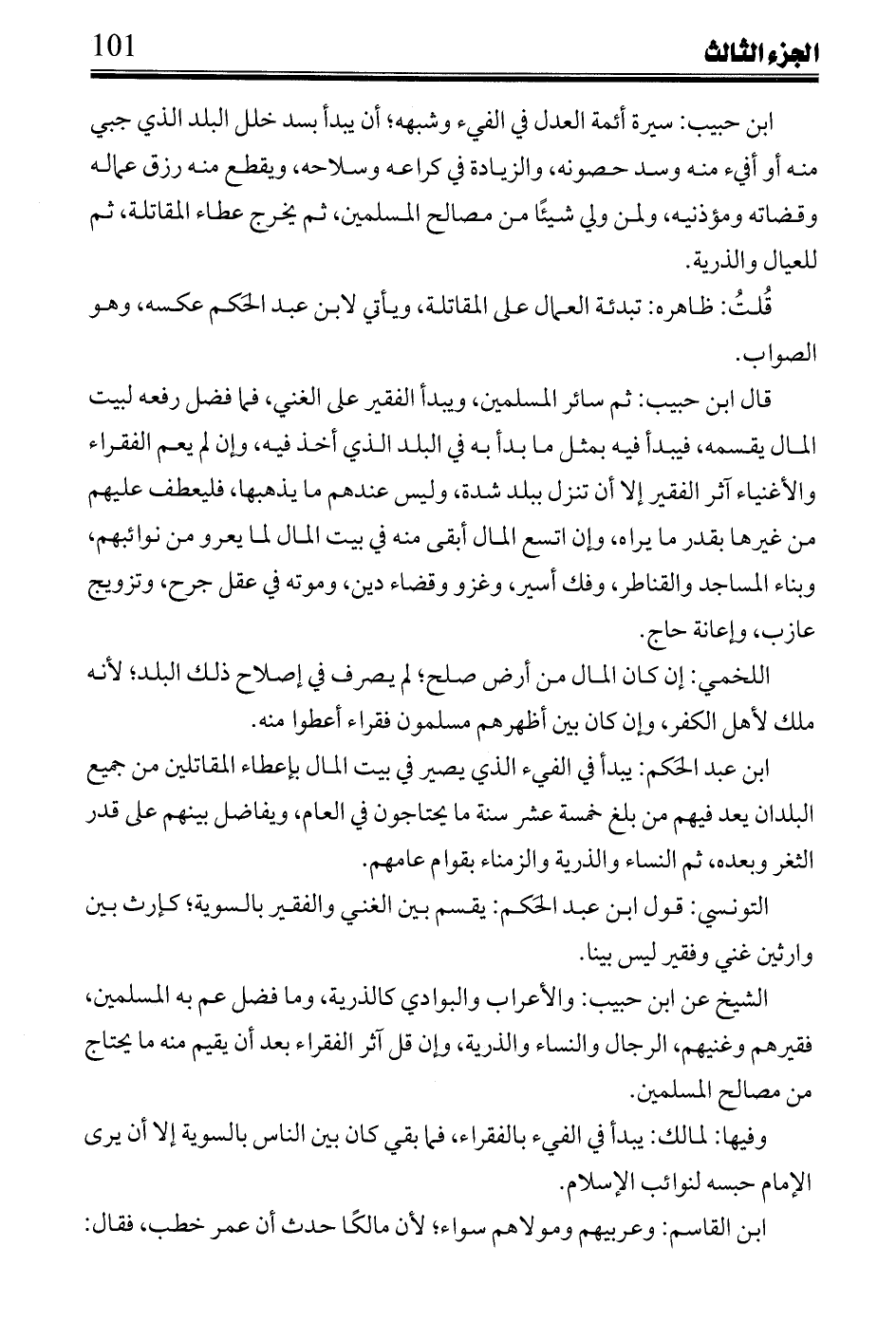 ابن حبيب: سيرة أئمة العدل في الفيء وشبهه؛ أن يبدأ بسد خلل البلد الذي جبي منه أو أفيء منه وسد حصونه، والزيادة في كراعه وسلاحه، ويقطع منه رزق عماله وقضاته ومؤذنيه، ولمن ولي شيئاً من مصالح المسلمين، ثم يخرج عطاء المقاتلة، ثم للعيال والذرية.