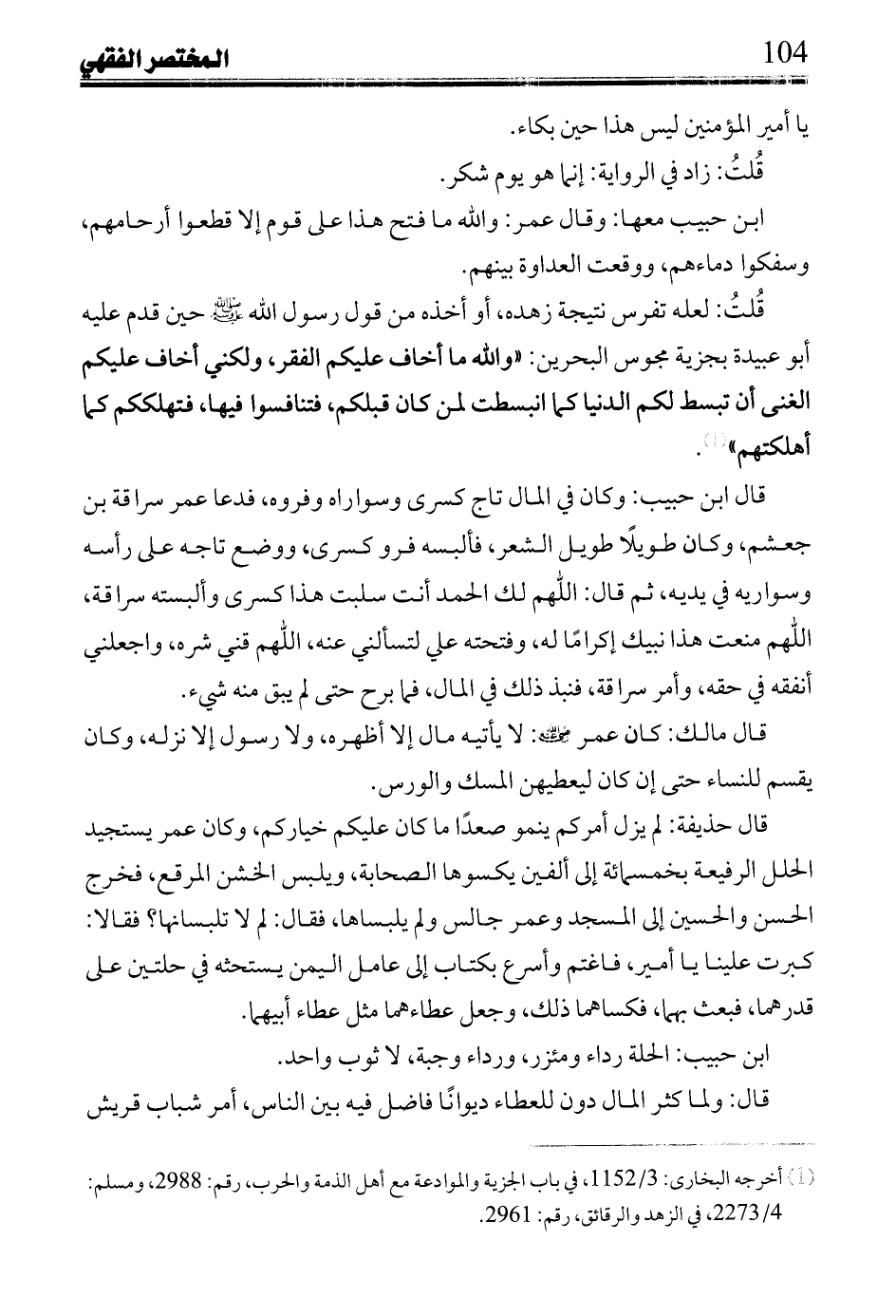 ابن حبيب معها: وقال عمر: والله ما فتح هذا على قوم إلا قطعوا أرحامهم، وسفكوا دماءهم، ووقعت العداوة بينهم.
