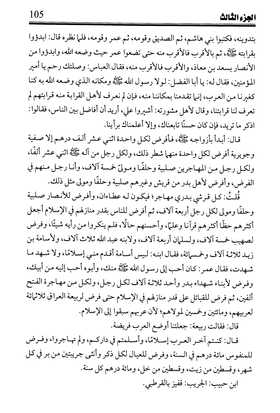 قُلتُ: كل قرشي بدري مهاجر؛ فيكون له عطاءان، وأفرض للأنصار صلبية وحلفاً ومولى لكل رجل أربعة آلاف، ثم أفرض للناس بقدر منازلهم في الإسلام أجعل أكثرهم حظاً أكثرهم قرآناً وعلماً، وأحسنهم حالاً، فلم ينكروا من رأيه شيئاً، وفرض لصهيب خمسة آلاف، ولسلمان أربعة آلاف، ولابنه عبد الله ثلاث آلاف، ولأسامة بن زيد ثلاثة آلاف وخمسمائة، فقال ابنه: ليس أسامة أقدم مني إسلاماً، ولا شهد ما شهدت، فقال عمر: كان أحب إلى رسول الله صلى الله عليه وسلم منك، وأبوه أحب إليه من أبيك، وفرض لأبناء شهداء بدر وأحد ثلاثة آلاف لكل رجل، ولكل من مهاجرة الفتح ألفين، ثم فرض للقبائل على قدر منازلهم في الإسلام حتى فرض لربيعة العراق ثلاثمائة لعربيهم، ومائتين وخمسين لمولاهم؛ لأن عربهم سبقوا إلى الإسلام.