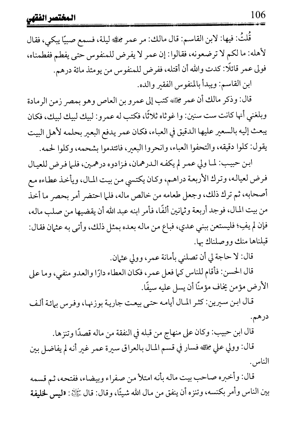 قُلتُ: فيها: لابن القاسم: قال مالك: مر عمر رضي الله عنه ليلة، فسمع صبياً يبكي، فقال لأهله: ما لكم لا ترضعونه، فقالوا: إن عمر لا يفرض للمنفوس حتى يفطم ففطمناه، فولى عمر قائلاً: كدت والله أن أقتله، ففرض للمنفوس من يومئذ مائة درهم.