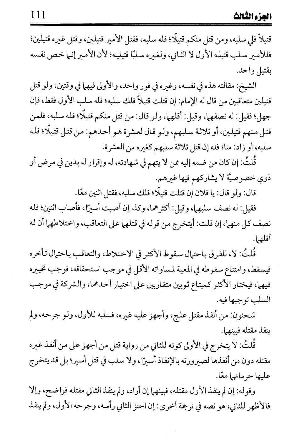 الشيخ: مقالته هذه في نفسه، وغيره في فور واحد، والأولى فيهما في وقتين، ولو قتل قتيلين متعاقبين من قال له الإمام: إن قتلت قتيلاً فلك سلبه؛ فله سلب الأول فقط، فإن جهل؛ فقيل: له نصفهما، وقيل: أقلهما، ولو قال: من قتل منكم قتيلاً؛ فله سلبه، فلمن قتل منهم قتيلين، أو ثلاثة سلبهم، ولو قال لعشرة هو أحدهم: من قتل قتيلاً؛ فله سلبه، أو زاد: منا؛ فله إن قتل ثلاثة سلبهم كغيره من العشرة.