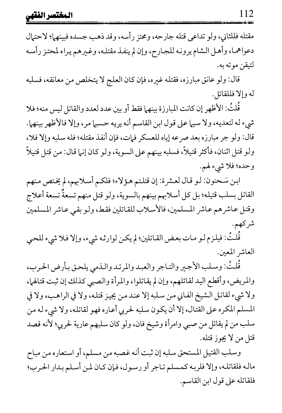 وقُلتُ: وسلب الأجير والتاجر والعبد والمرتد والذمي يلحق بأرض الحرب، والمريض، وأقطع اليد لقاتلهم، وإن لم يقاتلوا، والمرأة والصبي كذلك إن ثبت قتالهما، ولا شيء لقاتل الشيخ الفاني من سلبه إلا عند من يجيز قتله، ولا في الراهب، ولا في المسلم المكره على القتال، إلا أن يكون سلبه لحربي أعاره فهو لقاتله، ولا شيء له من سلب من لم يقاتل من صبي وامرأة وشيخ فان، ولو كان سلبهم عارية لحربي؛ لأنه قصد قتل من لا يحوز قتله.