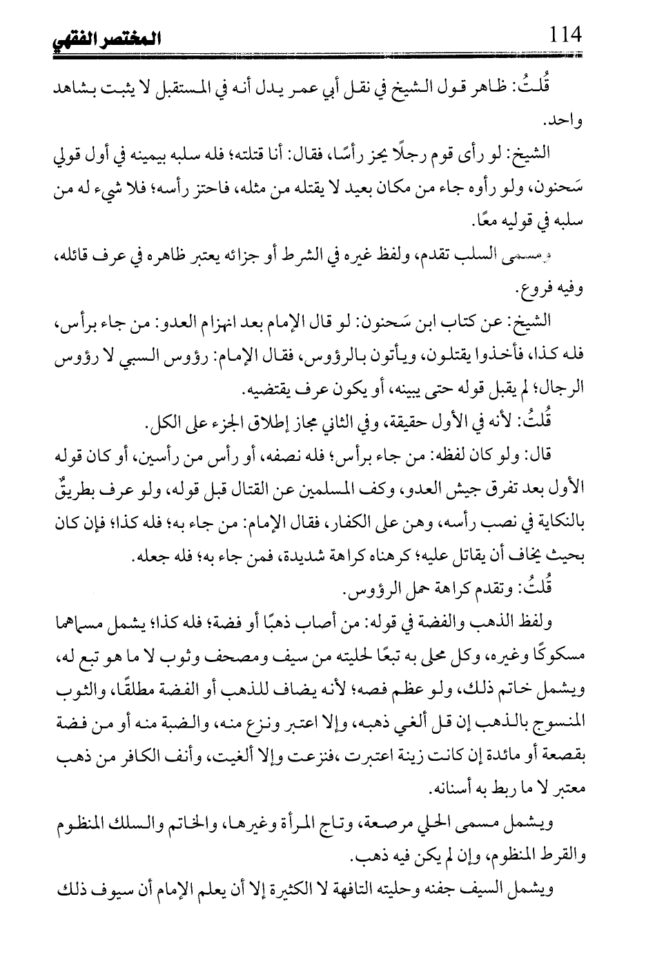 الشيخ: لو رأى قوم رجلاً يحز رأساً، فقال: أنا قتلته؛ فله سلبه بيمينه في أول قولي سَحنون، ولو رأوه جاء من مكان بعيد لا يقتله من مثله، فاحتز رأسه؛ فلا شيء له من سلبه في قوليه معاً.