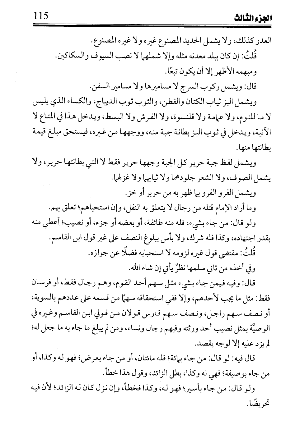 ويشمل البز ثياب الكتان والقطن، والثوب ثوب الديباج، والكساء الذي يلبس لا ما للنوم، ولا عمامة ولا قلنسوة، ولا الفرش ولا البسط، ويدخل هذا في المتاع لا الآنية، ويدخل في ثوب البز بطانة جبة منه، ووجهها من غيره، فيستحق مبلغ قيمة بطانتها منها.