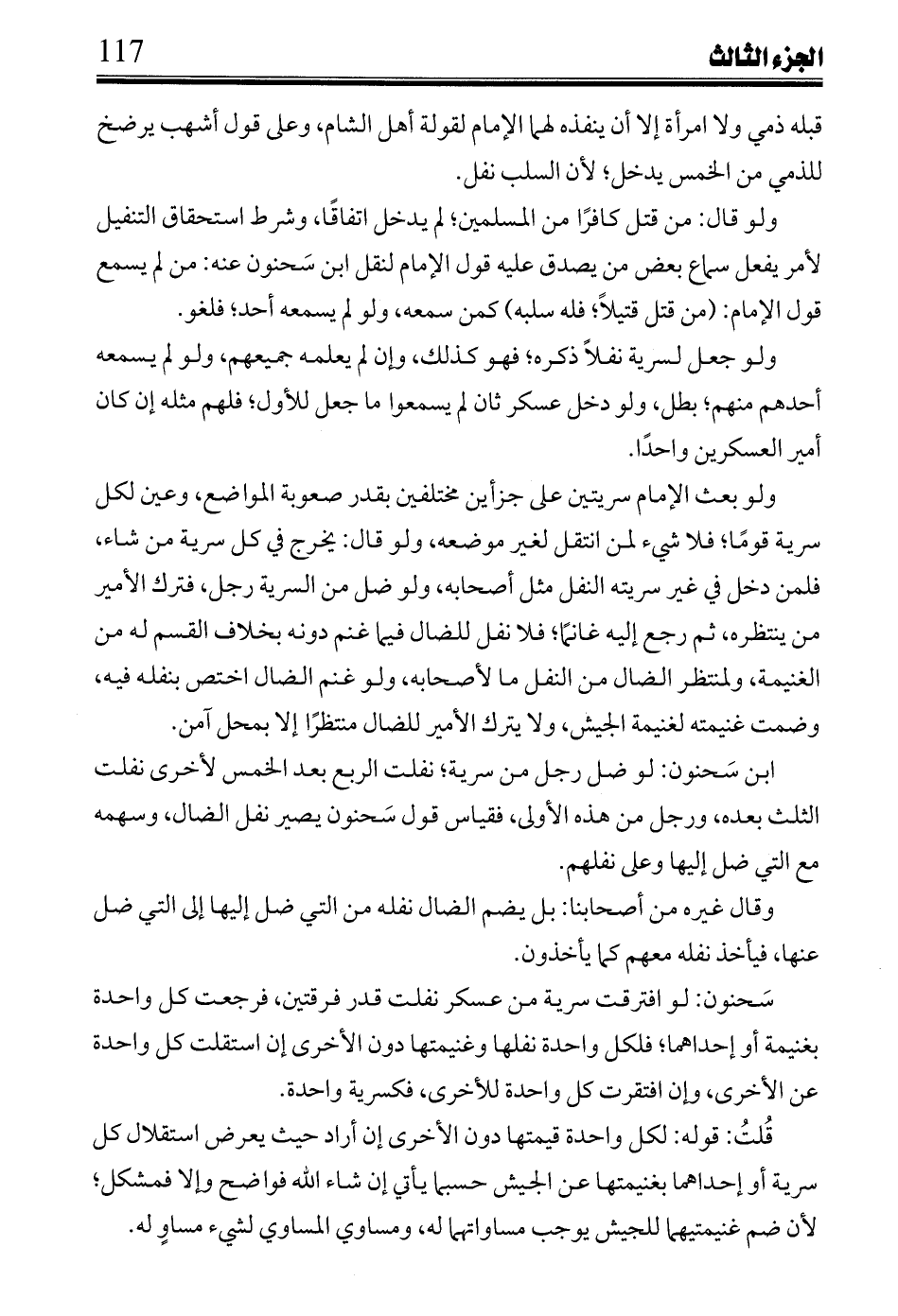 ابن سَحنون: لو ضل رجل من سرية؛ نفلت الربع بعد الخمس لأخرى نفلت الثلث بعده، ورجل من هذه الأولى، فقياس قول سَحنون يصير نفل الضال، وسهمه مع التي ضل إليها وعلى نفلهم.