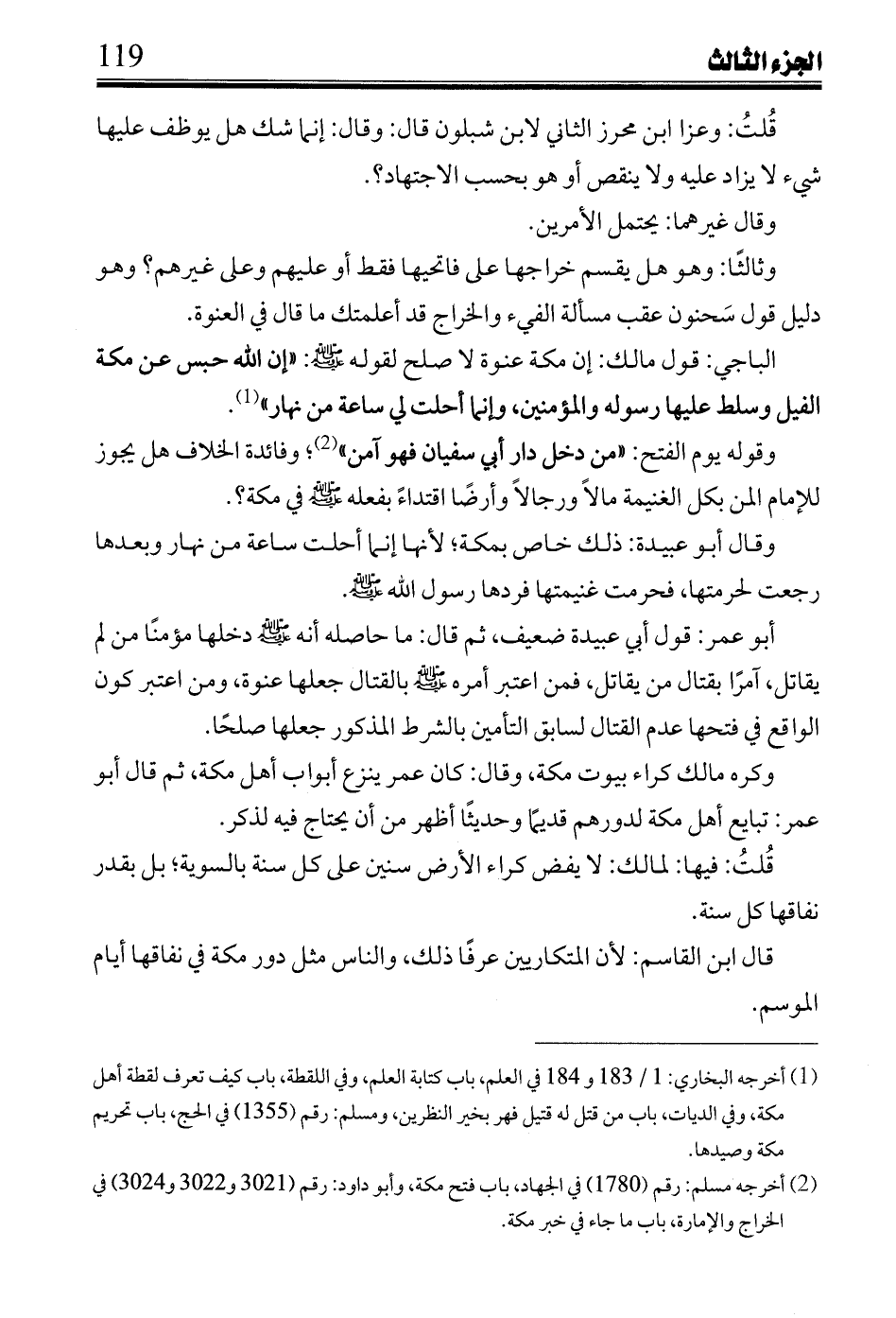 الباجي: قول مالك: إن مكة عنوة لا صلح لقوله صلى الله عليه وسلم: "إن الله حبس عن مكة الفيل وسلط عليها رسوله والمؤمنين، وإنما أحلت لي ساعة من نهار".