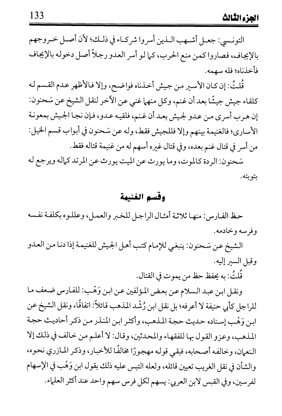 ونقل ابن عبد السلام عن بعض المؤلفين عن ابن وهب: للفارس ضعف ما للراجل كأبي حنيفة لا أعرفه؛ بل نقل ابن رشد المذهب قائلاً: اتفاقاً، ونقل الشيخ عن ابن وهب إسناده حديث حجة المذهب، وأكثر ابن المنذر من ذكر أحاديث حجة المذهب، وعزو القول بها للفقهاء والمحدثين، وقال: لا أعلم من خالف في ذلك إلا النعمان، وخالفه أصحابه، فبقي قوله مهجوراً مخالفاً للأخبار، وذكر المازري نحوه، والشأن في نقل الغريب تعيين قائله، ولعله التبس عليه ذلك بقول ابن وهب في الإسهام لفرسين، وفي القبس لابن العربي: يسهم لكل فرس سهم واحد عند أكثر العلماء.