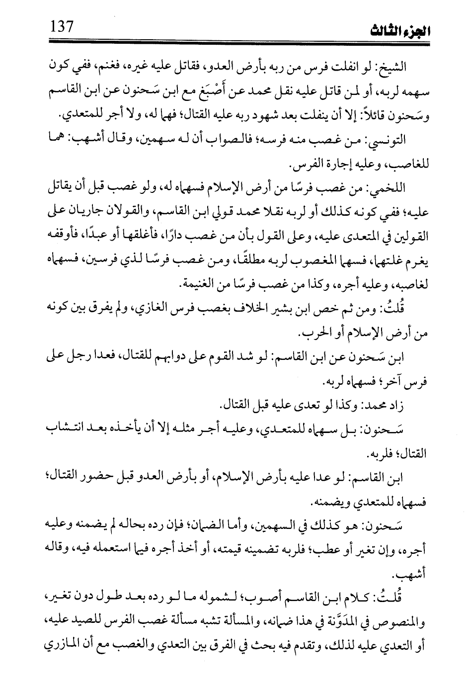 الشيخ: لو انفلت فرس من ربه بأرض العدو، فقاتل عليه غيره، فغنم، ففي كون سهمه لربه، أو لمن قاتل عليه نقل محمد عن أصبغ مع ابن سحنون عن ابن القاسم وسحنون قائلاً: إلا أن ينفلت بعد شهود ربه عليه القتال؛ فهما له، ولا أجر للمتعدي.