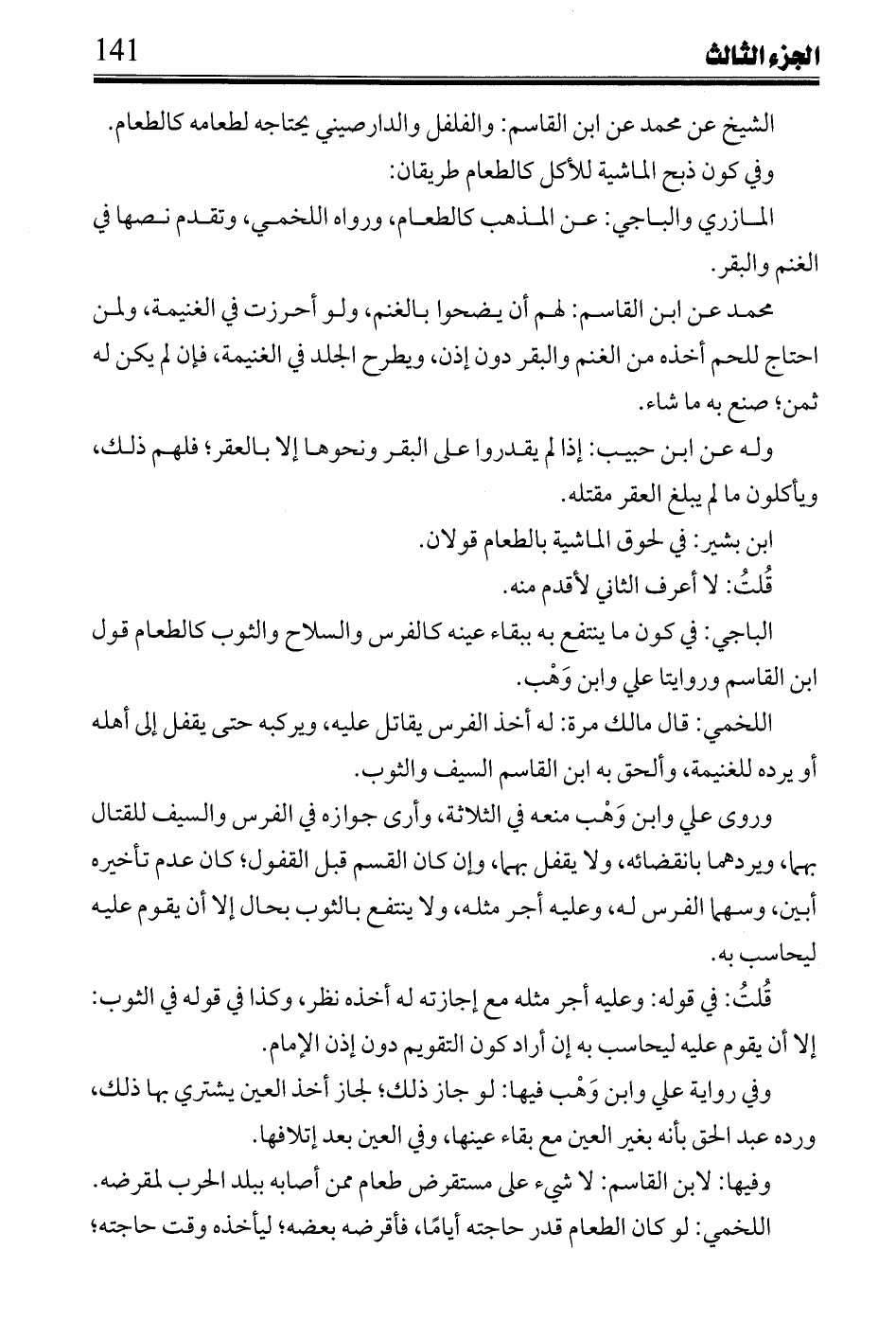 الباجي: في كون ما ينتفع به ببقاء عينه كالفرس والسلاح والثوب كالطعام قول ابن القاسم وروايتا على وابن وهب.