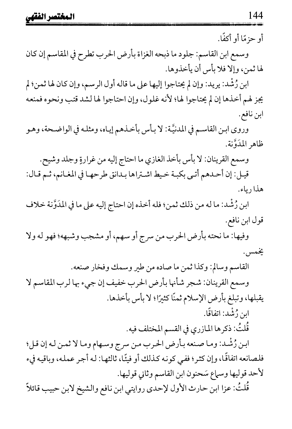 ابن رشد: يريد: وإن لم يحتاجوا إليها على ما قاله أول الرسم، وإن كان لها ثمن؛ لم يجز لهم أخذها إن لم يحتاجوا لها؛ لأنه غلول، وإن احتاجه لها لشد قتب ونحوه فمنعه ابن نافع.