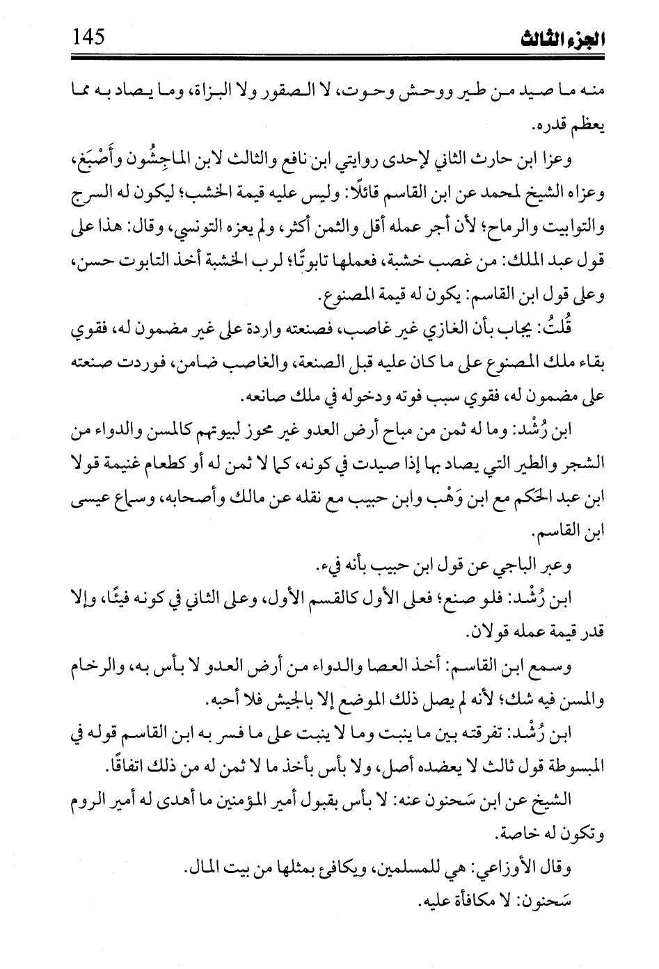 ابن رشد: وما له ثمن من مباح أرض العدو غير محوز لبيوتهم كالمسن والدواء من الشجر والطير التي يصاد بها إذا صيدت في كونه، كما لا ثمن له أو كطعام غنيمة قولا ابن عبد الحكم مع ابن وهب وابن حبيب مع نقله عن مالك وأصحابه، وسماع عيسى ابن القاسم.