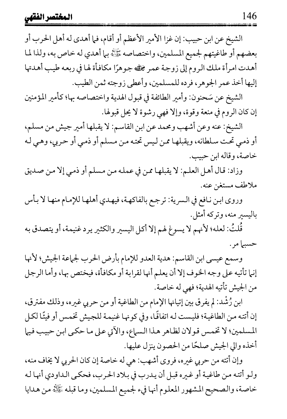 الشيخ عن ابن حبيب: إن غزا الأمير الأعظم أو أقام، فما أهدى له أهل الحرب أو بعضهم أو طاغيتهم لجميع المسلمين، واختصاصه صلى الله عليه وسلم بما أهدي له خاص به، ولذا لما أهدت امرأة ملك الروم إلى زوجة عمررضي الله عنه جوهراً مكافأة لها في ربعه طيب أهدتها إليها أخذ عمر الجوهر، فرده للمسلمين، وأعطى زوجته ثمن الطيب.