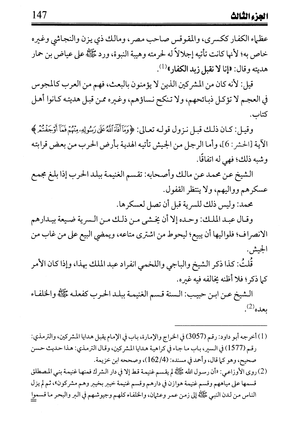 الشيخ عن ابن حبيب: السنة قسم الغنيمة ببلد الحرب كفعله صلى الله عليه وسلم والخلفاء بعده.