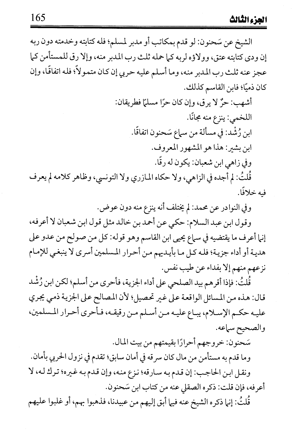 وقول ابن عبد السلام: حكي عن أحمد بن خالد مثل قول ابن شعبان لا أعرفه، إنما أعرف ما يقتضيه في سماع يحيى ابن القاسم وهو قوله: كل من صولح من عدو على هدية أو أداء جزية؛ فله كل ما بأيديهم من أحرار المسلمين أسرى لا ينبغي للإمام نزعهم منهم إلا بفداء عن طيب نفس.