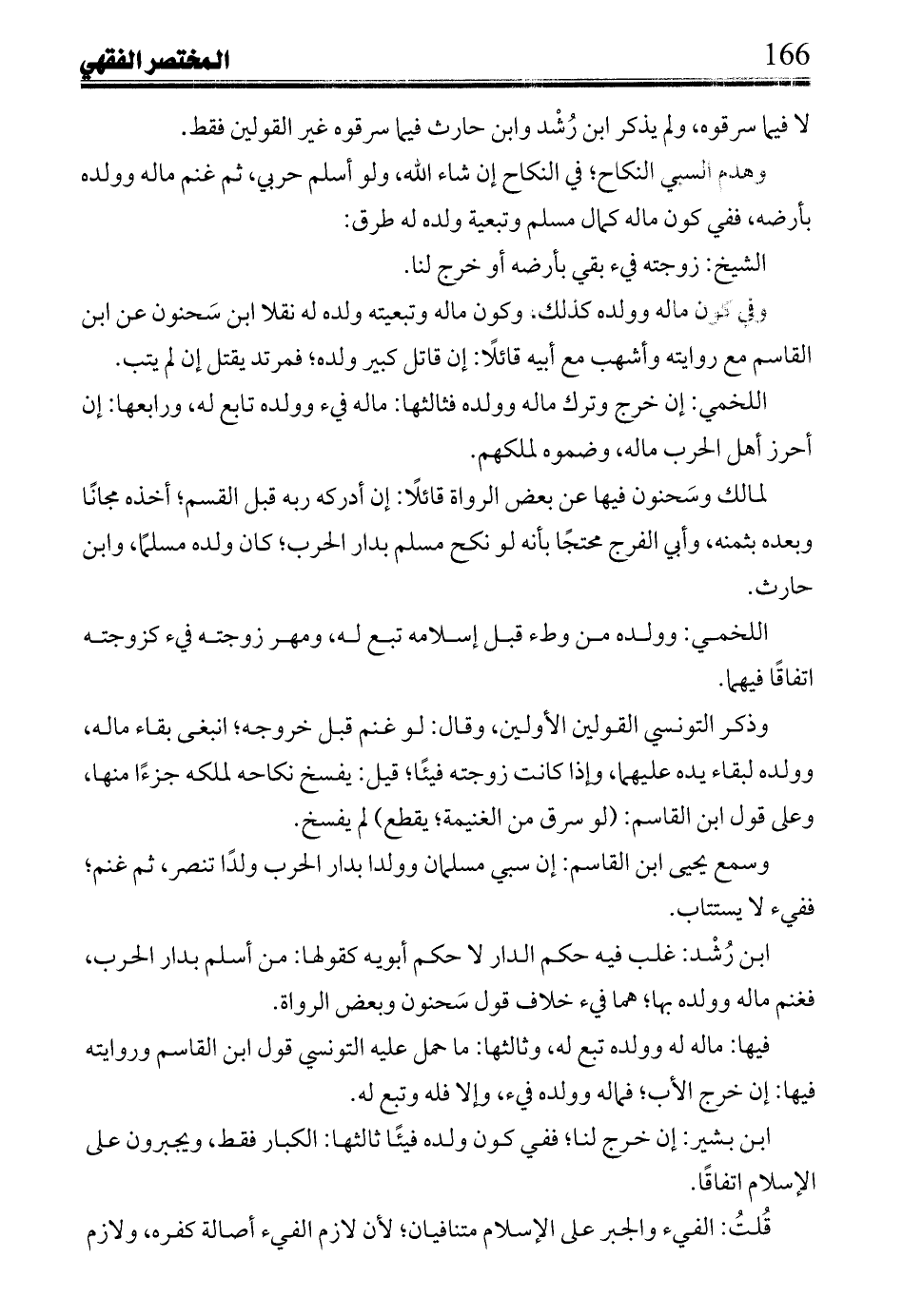 وذكر التونسي القولين الأولين, وقال: لو غنم قبل خروجه؛ انبغى بقاء ماله, وولده لبقاء يده عليهما, وإذا كانت زوجته فيئا؛ يفسخ نكاحه لملكه جزءا منها, وعلى قول ابن القاسم: (لو سرق من الغنيمة؛ يقطع) لم يفسخ.