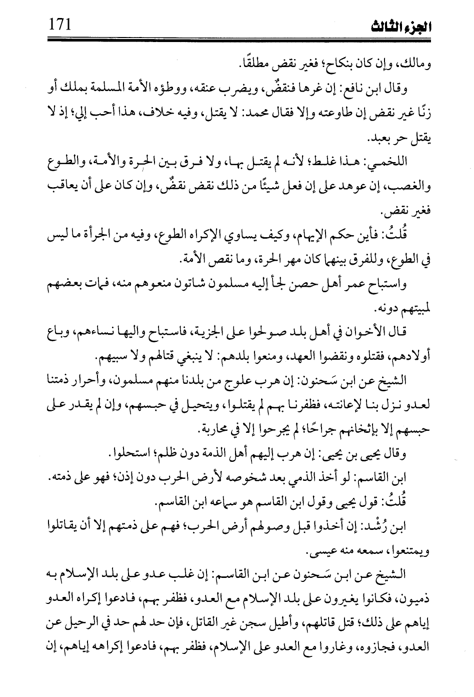 الشيخ عن ابن سحنون عن ابن القاسم: إن غلب عدو على بلد الإسلام به ذميون, فكانوا يغيرون على بلد الإسلام مع العدو, فظفر بهم, فادعوا إكراه العدو إياهم على ذلك؛ قتل قاتلهم, وأطيل سجن غير القاتل, فإن حد لهم حد في الرحيل عن العدو, فجازوه, وغاروا مع العدو على الإسلام, فظفر بهم, فادعوا إكراهه إياهم, إن