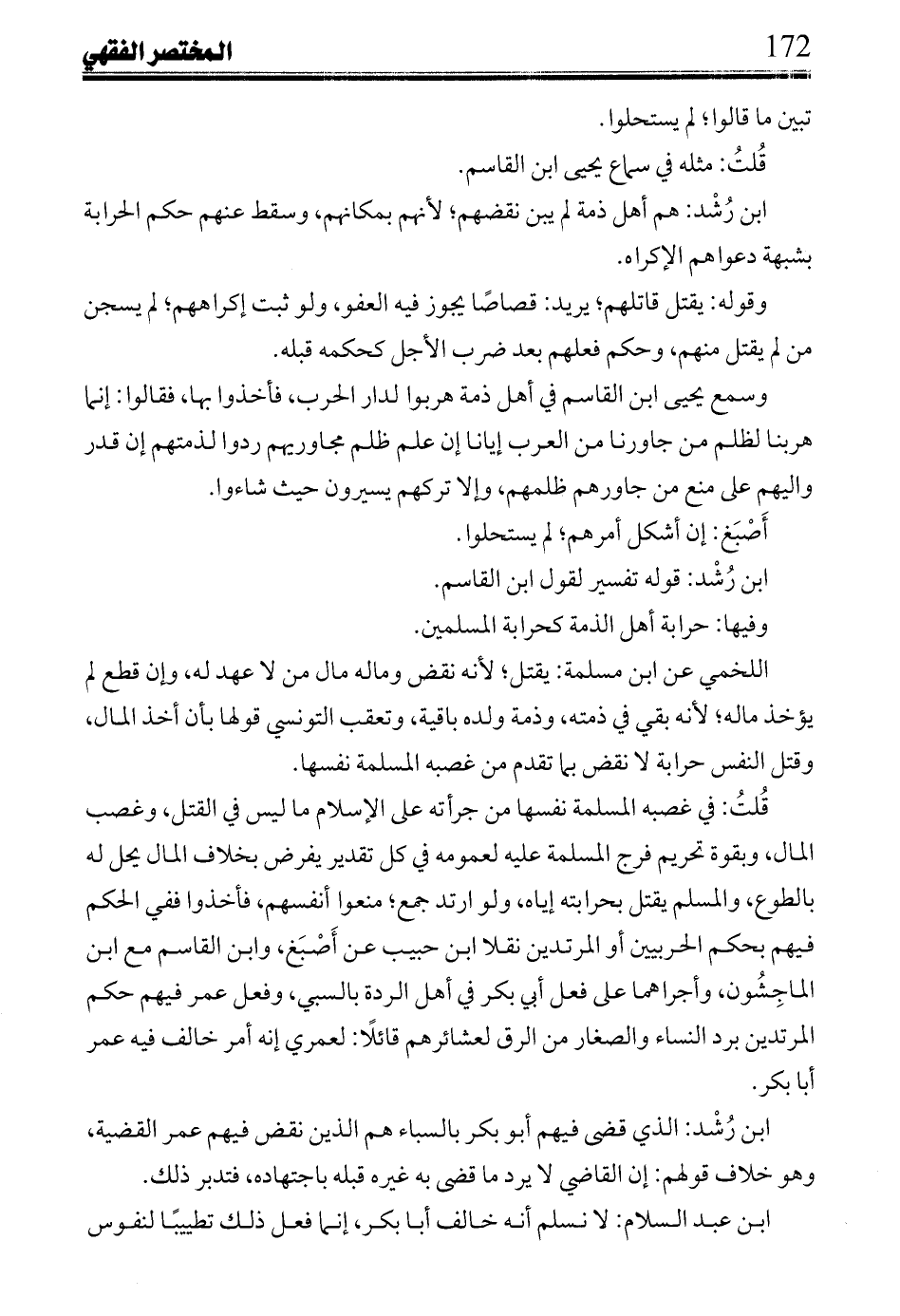 ابن رشد: الذي قضى فيهم أبو بكر بالسباء هم الذين نقض فيهم عمر القضية, وهو خلاف قولهم: إن القاضي لا يرد ما قضى به غيره قبله باجتهاده, فتدبر ذلك.