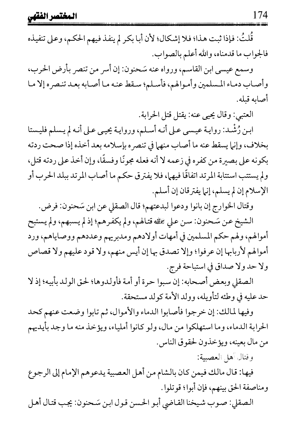 الشيخ عن سحنون: سن على رضي الله عنه قتالهم, ولم يكفرهم؛ إذ لم يسبهم, ولم يستبح أموالهم, ولهم حكم المسلمين في أمهات أولادهم ومدبريهم وعددهم ووصاياهم, ورد أموالهم لأربابها إن عرفوا؛ وإلا تصدق بها إن أيس منهم, ولا قود عليهم ولا قصاص ولا حد ولا صداق في استباحة فرج.