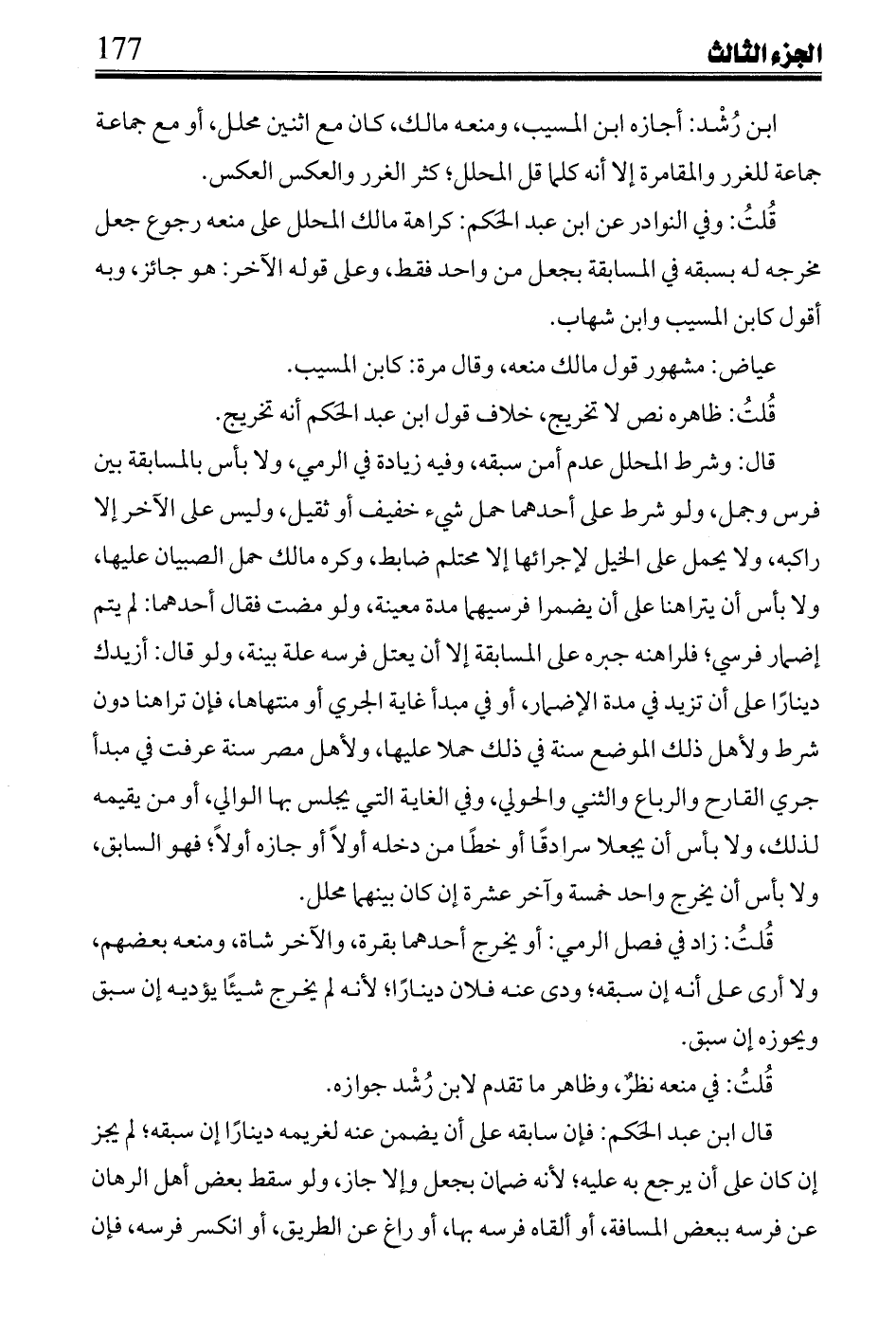 قال: وشرط المحلل عدم أمن سبقه، وفيه زيادة في الرمي، ولا بأس بالمسابقة بين فرس وجمل، ولو شرط على أحدهما حمل شيء خفيف أو ثقيل، وليس على الآخر إلا راكبه، ولا يحمل على الخيل لإجرائها إلا محتلم ضابط، وكره مالك حمل الصبيان عليها، ولا بأس أن يتراهنا على أن يضمرا فرسيهما مدة معينة، ولو مضت فقال أحدهما: لم يتم إضمار فرسي؛ فلراهنه جبره على المسابقة إلا أن يعتل فرسه علة بينة، ولو قال: أزيدك ديناراً على أن تزيد في مدة الإضمار، أو في مبدأ غاية الجري أو منتهاها، فإن تراهنا دون شرط ولأهل ذلك الموضع سنة في ذلك حملا عليها، ولأهل مصر سنة عرفت في مبدأ جري القارح والرباع والثني والحولي، وفي الغاية التي يجلس بها الوالي، أو من يقيمه لذلك، ولا بأس أن يجعلا سرادقاً أو خطاً من دخله أولاً أو جازه أولاً؛ فهو السابق، ولا بأس أن يخرج واحد خمسة وآخر عشرة إن كان بينهما محلل.
