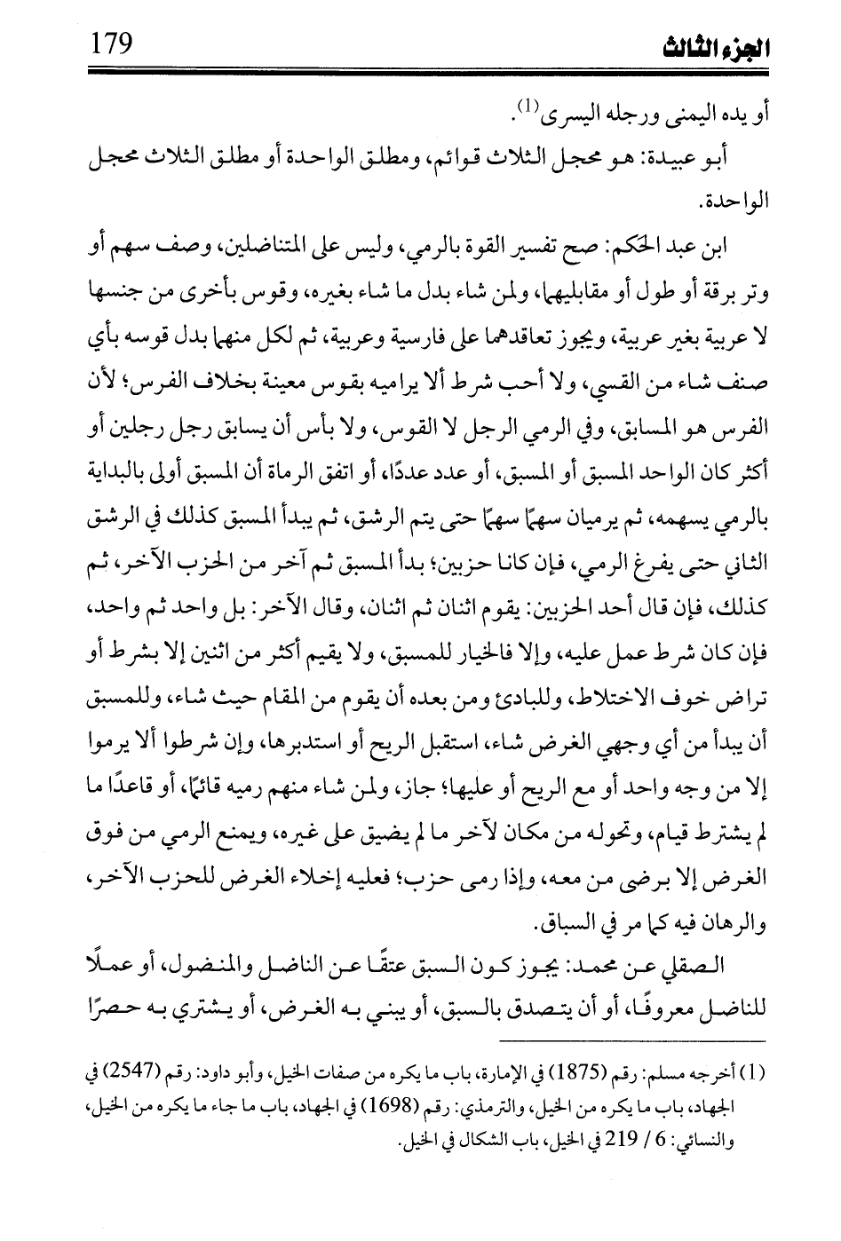 ابن عبد الحكم: صح تفسير القوة بالرمي، وليس على المتناضلين، وصف سهم أو وتر برقة أو طول أو مقابليهما، ولمن شاء بدل ما شاء بغيره، وقوس بأخرى من جنسها لا عربية بغير عربية، ويجوز تعاقدهما على فارسية وعربية، ثم لكل منهما بدل قوسه بأي صنف شاء من القسي، ولا أحب شرط ألا يراميه بقوس معينة بخلاف الفرس؛ لأن الفرس هو المسابق، وفي الرمي الرجل لا القوس، ولا بأس أن يسابق رجل رجلين أو أكثر الواحد المسبق أو المسبق، أو عدد عدداً، أو اتفق الرماة أن المسبق أولى بالبداية بالرمي يسهمه، ثم يرميان سهماً سهماً حتى يتم الرشق، ثم يبدأ المسبق كذلك في الرشق الثاني حتى يفرغ الرمي، فإن كانا حزبين؛ بدأ المسبق ثم آخر من الحزب الآخر، ثم كذلك، فإن قال أحد الحزبين: يقوم اثنان ثم اثنان، وقال الآخر: بل واحد ثم واحد، فإن كان شرط عمل عليه، وإلا فالخيار للمسبق، ولا يقيم أكثر من اثنين إلا بشرط أو تراض خوف الاختلاط، وللبادئ ومن بعده أن يقوم من المقام حيث شاء، وللمسبق أن يبدأ من أي وجهي الغرض شاء، استقبل الريح أو استدبرها، وإن شرطوا ألا يرموا إلا من وجه واحد أو مع الريح أو عليها؛ جاز، ولمن شاء منهم رميه قائماً، أو قاعداً ما لم يشترط قيام، وتحوله من مكان لآخر ما لم يضيق على غيره، ويمنع الرمي من فوق الغرض إلا برضى من معه، وإذا رمى حزب؛ فعليه إخلاء الغرض للحزب الآخر، والرهان فيه كما مر في السباق.