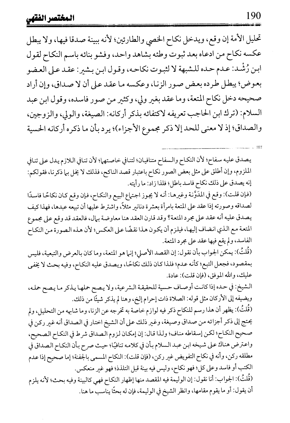 تحليل الأمة إن وقع، ويدخل نكاح الخصي والطارئين؛ لأنه ببينة صدقا فيها، ولا يبطل عكسه نكاح من ادعاه بعد ثبوت وطئه بشاهد واحد، وفشوا بنائه باسم النكاح لقول ابن رشد: عدم حده للشبهة لا لثبوت نكاحه، وقول ابن بشير: عقد علي العضو بعوض، يبطل طرده بعض صور الزنا، وعكسه ما عقد علي أن صداق، وإن أراد صحيحة دخل نكاح المتعة، وما عقد بغير ولي، وكثير من صور فاسده، وقول ابن عبد السلام: (ترك ابن الحاجب تعريفه لاكتفائه بذكر أركانه: الصيغة، والوالي، والزوجين، والصداق؛ إذ لا معنى للحد إلا ذكر مجموع الأجزاء)؛ يرد بأن ما ذكره أركانه الحسية