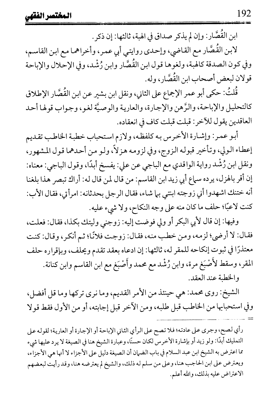 لابن القصار مع القاضي، وإحدى روايتي أبي عمر، وأخراهما مع ابن القاسم، وفي كون الصدقة كالهبة، ولغوها قول ابن القصار وابن رشد، وفي الإحلال والإباحة قولان لبعض أصحاب ابن القصار، وله.