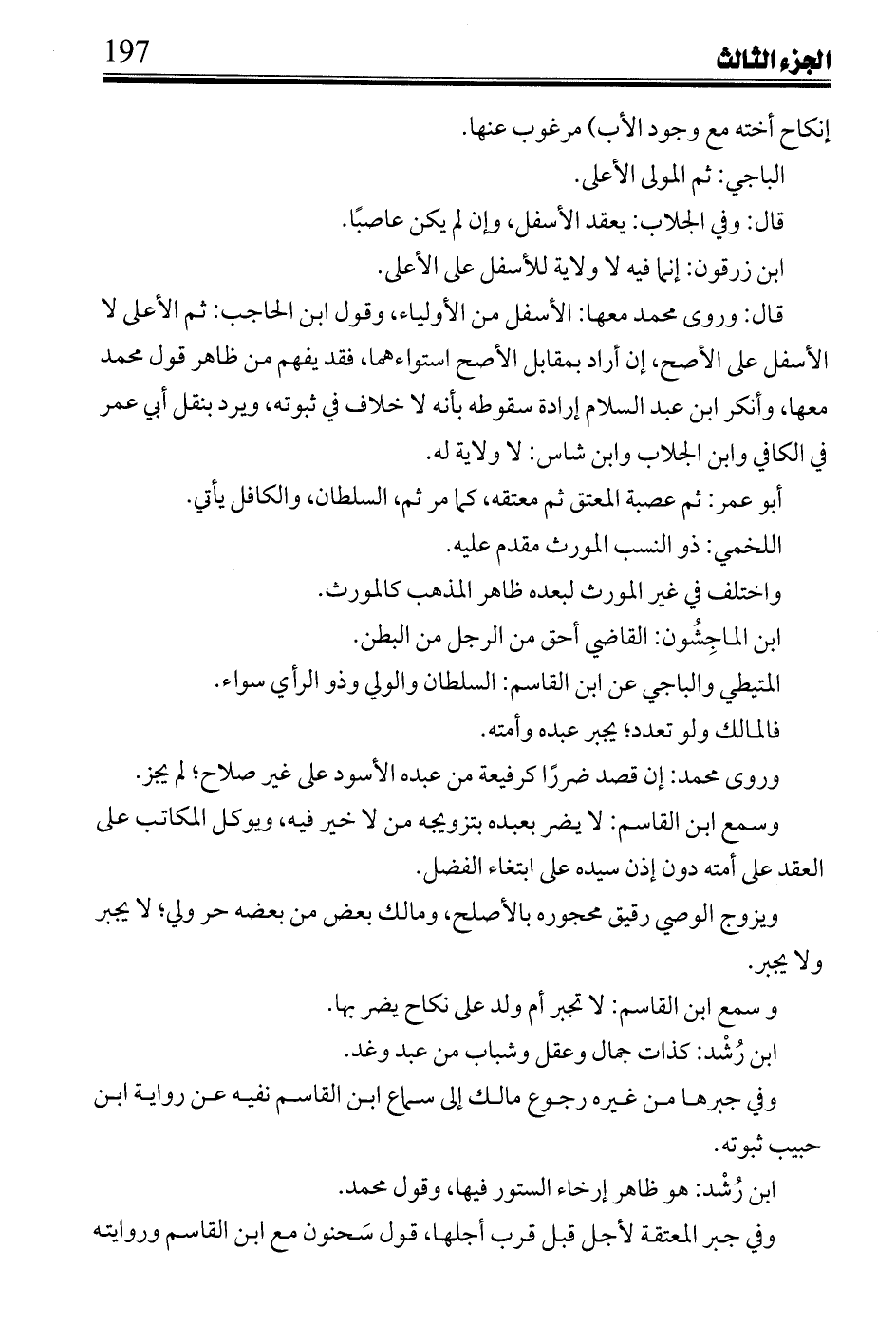 قال: وروى محمد معها: الأسفل من الأولياء، وقول ابن الحاجب: ثم الأعلى لا الأسفل علي الأصح، إن أراد بمقابل الأصح، إن أراد بمقابل الأصح استواءهما، فقد يفهم من ظاهر قول محمد معها، وأنكر ابن عبد السلام إرادة سقوطه بأنه لا خلاف في ثبوته، ويرد بنقل أبي عمر في الكافي وابن الجلاب وابن شاس: لا ولاية له.