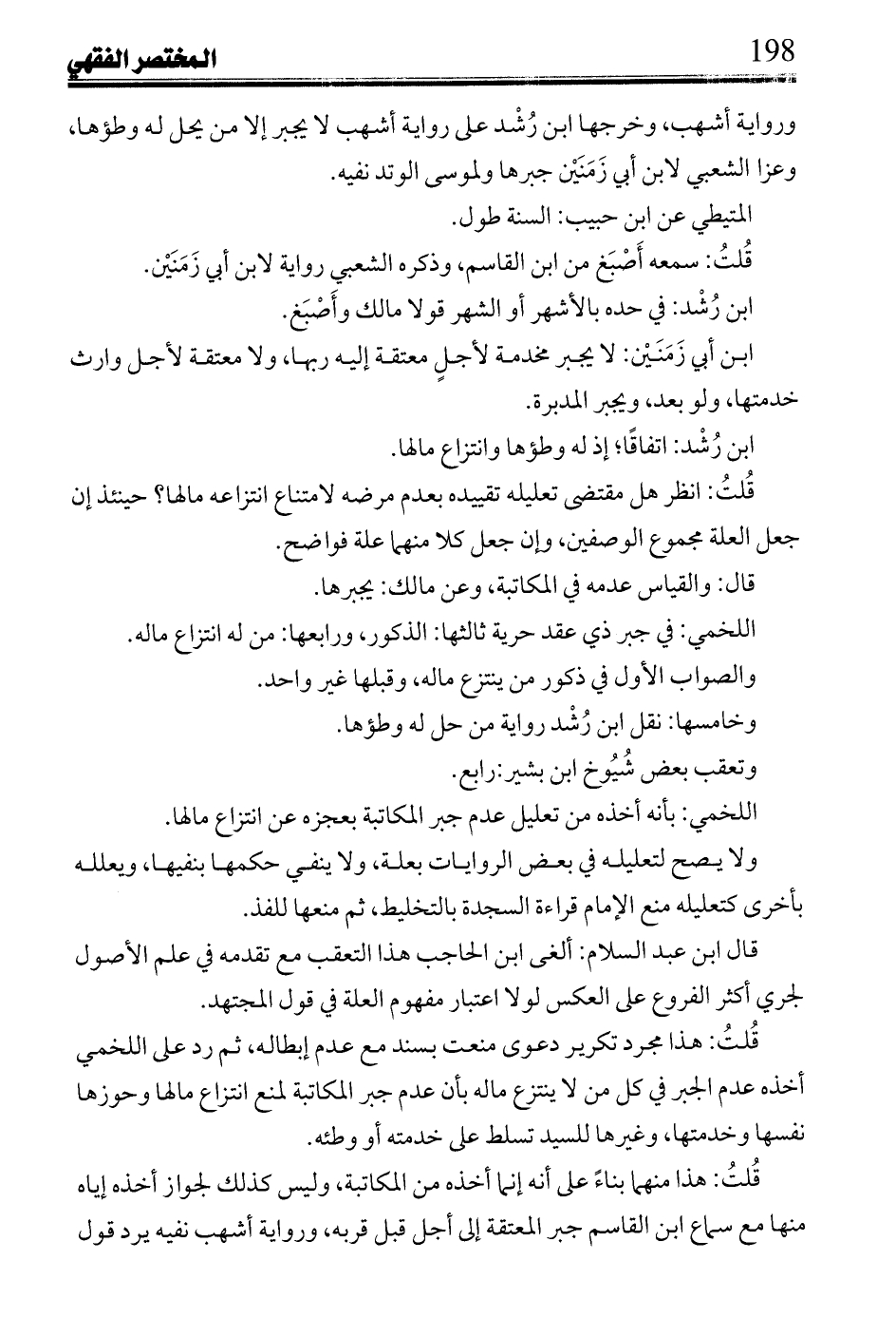 قلت: هذا مجرد تكرير دعوى منعت بسند مع عدم إبطاله، ثم رد علي اللخمي أخذه عدم الجبر في كل من لا ينتزع ماله بان عدم جبر المكاتبة لمنع انتزاع مالها وحوزها نفسها وخدمتها، وغيرها للسيد تسلط علي خدمته أو وطئه.