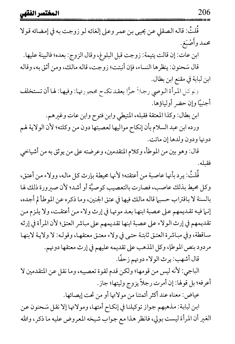 قُلتُ: يرد بأنها عاصبة من أعتقته؛ لأنها محيطة بإرث كل ماله، وولاء من أعتق، وكل محيط بذلك عاصب، فصارت بالتعصيب كوصيَّة أو أشد؛ لأن صيرورة ذلك لها بالنسبة لا باقتراب حسبما قاله مالك فيها في عتق الجنين، وما ذكره عن الموطأ لم أجده، إنما فيه تقديمهم على عصبة ابنها بعد موتها في إرث ولاء من أعتقت، ولا يلزم من تقديمهم في إرث الولاء على عصبة ابنها تقديمهم على مباشر العتق؛ لأن المرأة في إرثه ساقطة، وفي مباشرة العتق ثابتة حتى في ولاء معتق معتقها، وقوله: لا ولاية لأبنها مردود بنص الموطإ، وكل المذهب على تقديمه عليهم في إرث معتقها دونهم.