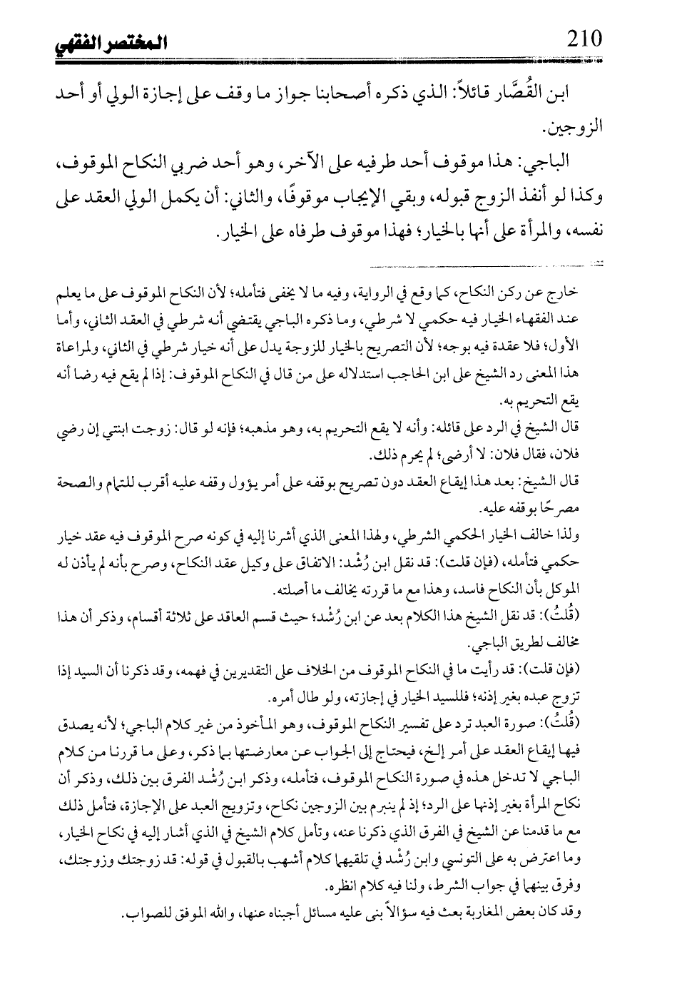 ابن القُصَّار قائلًا: الذي ذكره أصحابنا جواز ما وقف على إجازة الولي أو أحد الزوجين.