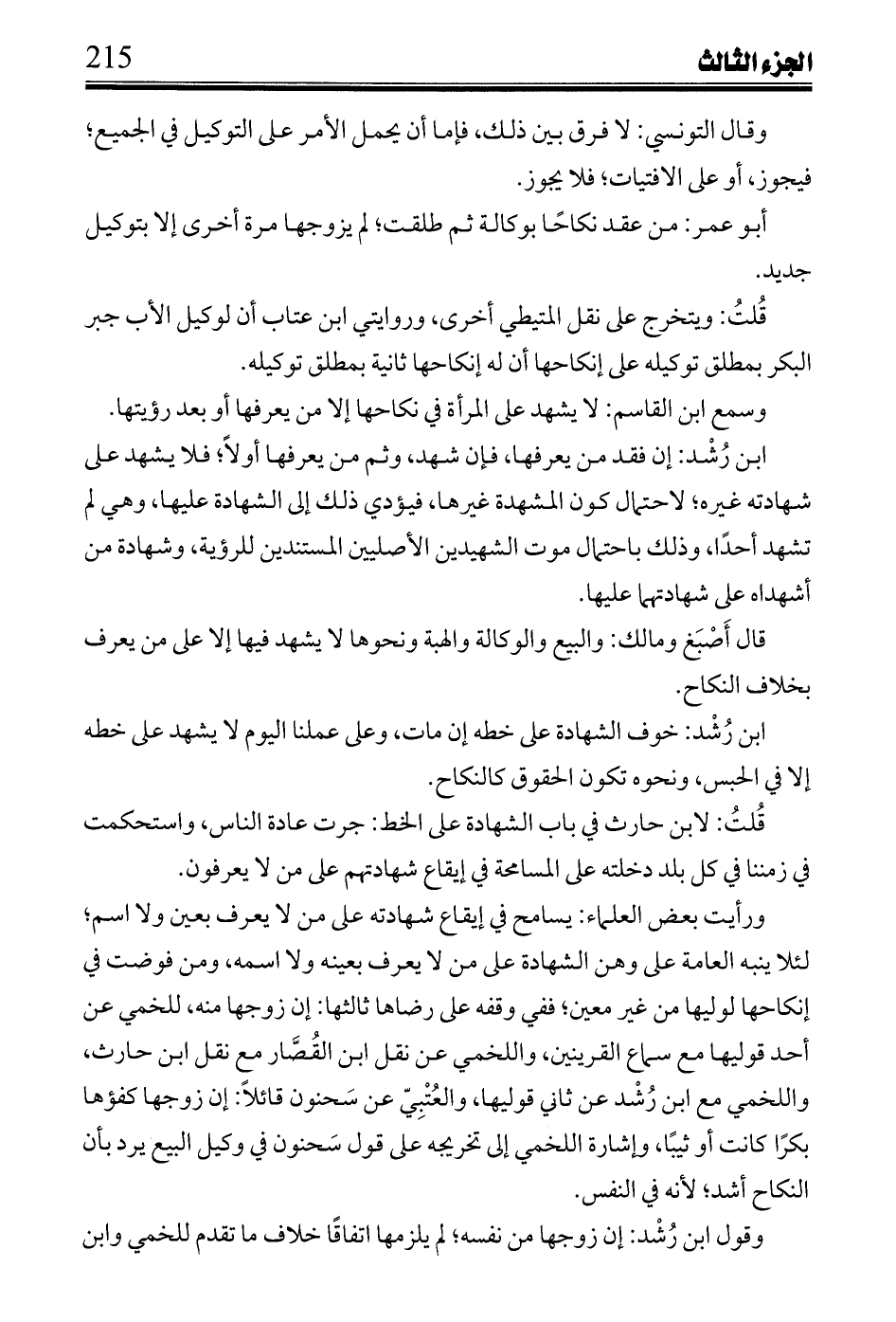 ابن رُشْد: إن فقد من يعرفها، فإن شهد، وثم من يعرفها أولًا؛ فلا يشهد على شهادته غيره؛ لاحتمال كون المشهدة غيرها، فيؤدي ذلك إلى الشهادة عليها، وهي لم تشهد أحدًا، وذلك باحتمال موت الشهيدين الأصليين المستندين للرؤية، وشهادة من أشهداه على شهادتهما عليها.