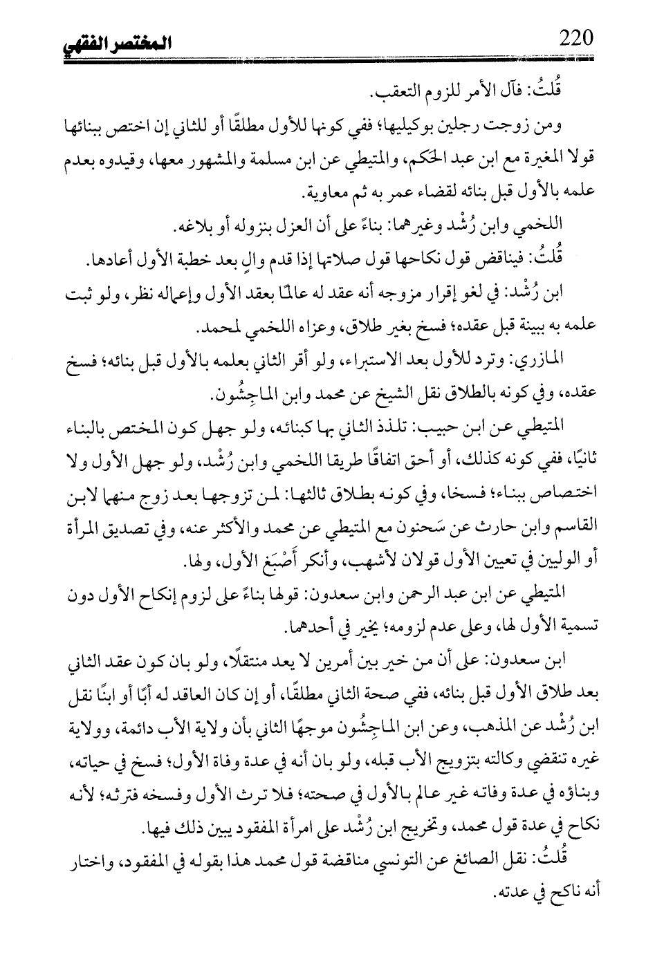 قُلتُ: نقل الصائغ عن التونسي مناقضة قول محمد هذا بقوله في المفقود، واختار أنه ناكح في عدته.
