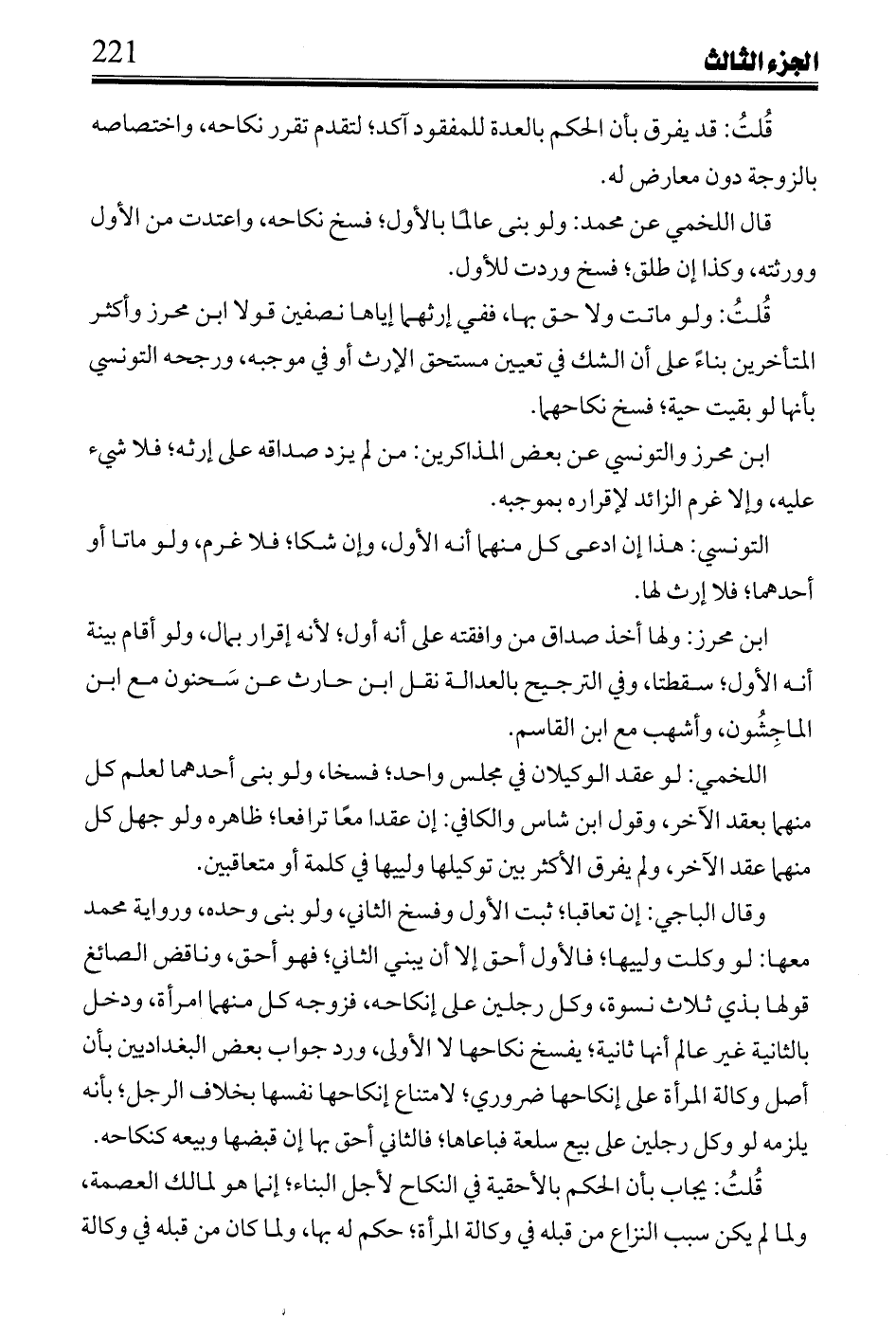 وقال الباجي: إن تعاقبا؛ ثبت الول وفسخ الثاني، ولو بنى وحده، ورواية محمد معها: لو وكلت ولييها؛ فالأول أحق إلا أن يبني الثاني؛ فهو أحق، وناقض الصائغ قولها بذي ثلاث نسوة، وكل رجلين على إنكاحه، فزوجه كل منهما امرأة، ودخل بالثانية غير عالم أنها ثانية؛ يفسخ نكاحها لا الأولى، ورد جواب بعض البغداديين بأن أصل وكالة المرأة على إنكاحها ضروري؛ لامتناع إنكاحها نفسها بخلاف الرجل؛ بأنه يلزمه لو وكل رجلين على بيع سلعة فباعاها؛ فالثاني أحق بها إن قبضها وبيعه كنكاحه.