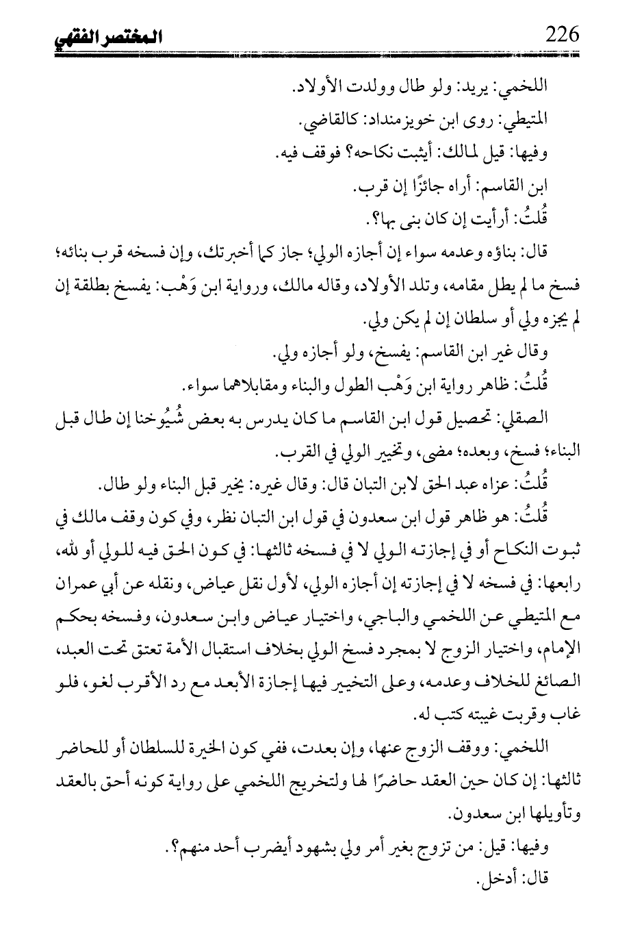 قلت: هو ظاهر قول ابن سعدون في قول ابن التبان نظر، وفي كون وقف مالك في ثبوت النكاح أو في إجازته الولي لا في فسخه ثالثها: في كون الحق فيه للولي أو لله، رابعها: في فسخه لا في إجازته إن أجازة الولي، لأول نقل عياض، ونقله عن أبي عمران مع المتيطي عن اللخمي والباجي، واختيار عياض وابن سعدون، وفسخه بحكم الإمام، واختيار الزوج لا بمجرد فسخ الولي بخلاف استقبال الأمة تعتق تحت العبد، الصائغ للخلاف وعدمه، وعلى التخيير فيها إجازة الأبعد مع رد الأقرب لغو، فلو غاب وقربت غيبته كتب له.