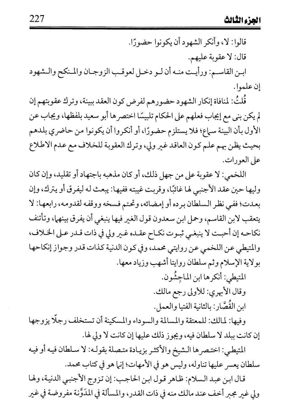 اللخمي: لا عقوبة على من جهل ذلك، أو كان مذهبه باجتهاد أو تقليد، وإن كان وليها حين عقد الأجنبي لها غائباً، وقربت غيبته ففيها: يبعث له ليفرق أو يترك، وإن بعدت؛ ففي نظر السلطان برده أو إمضائه، وتحتم فسخه ووقف لقدومه، رابعها: لا يتعقب لابن القاسم، وحمل ابن سعدون قول الغير فيها ينبغي أن يفرق بينهما، وتأتنف نكاحه إن أحبت لا ينبغي ثبوت نكاح عقده غير ولي في ذات قدر على الخلاف، والمتيطي عن اللخمي عن روايتي محمد، وفي كون الدنية كذات قدر وجواز إنكاحها بولاية الإسلام وثم سلطان ورايتا أشهب وزياد معها.