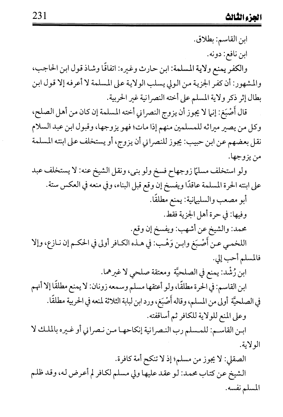 ابن القاسم: للمسلم رب النصرانية إنكاحها من نصراني أو غيره بالملك لا الولاية.