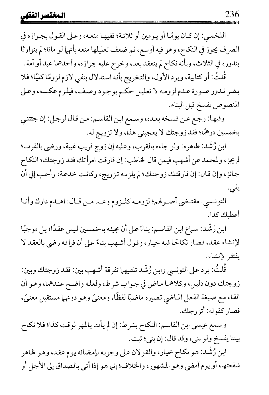 قلت: يرد على التونسي وابن رشد تلقيهما تفرقة أشهب بين: فقد زوجتك وبين: زوجتك جون دليل، وكلاهما ماض في جواب شرط، ولعله واضح عندهما، وهو أن الفاء مع صيغة الفعل الماضي تصيره ماضياً لفظياً، ومعنى وهو دونهما مستقبل معنى، فصار كقوله: أتزوجك.