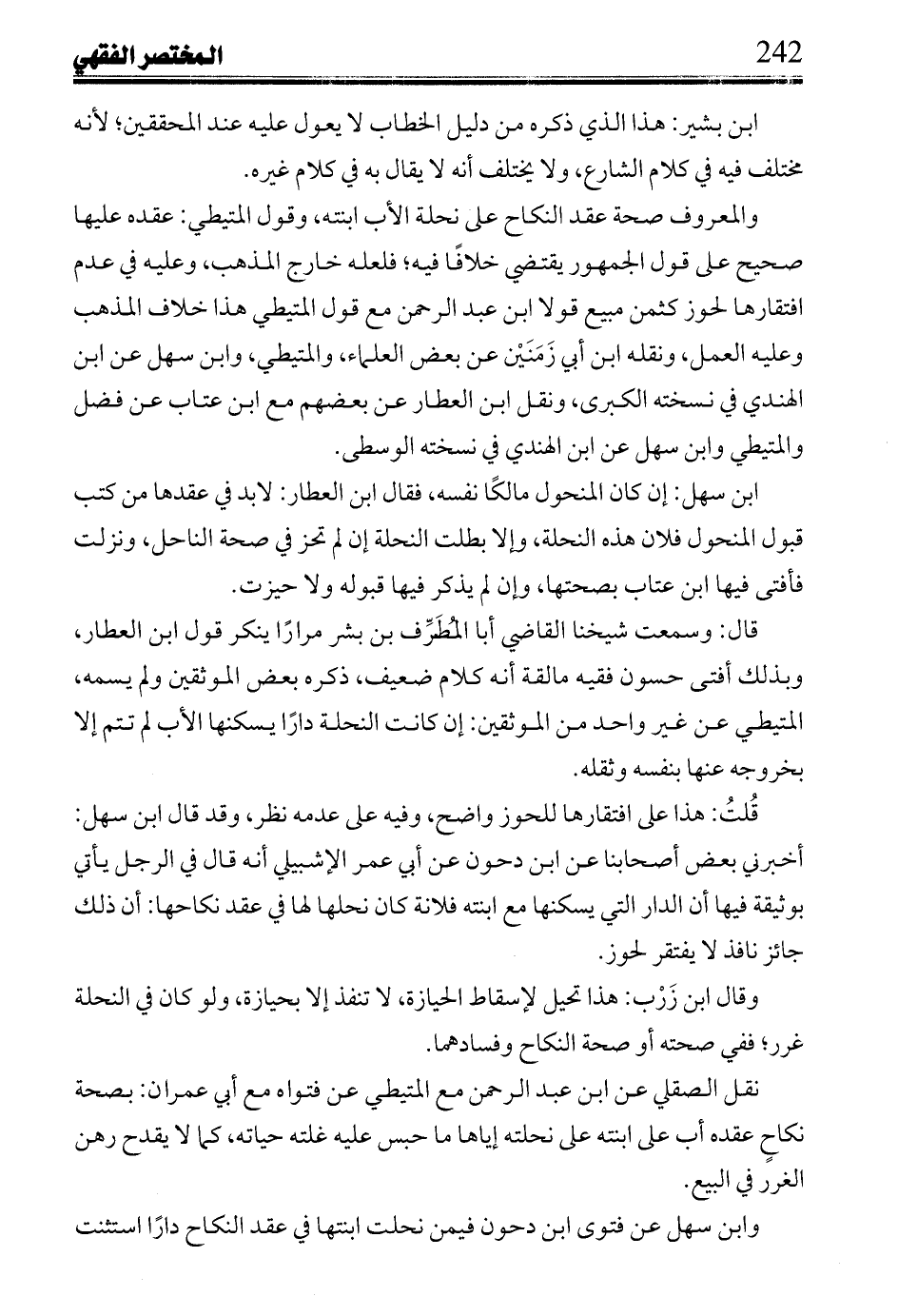والمعروف صحة عقد النكاح على نحلة الأب ابنته، وقول المتيطي: عقده عليها صحيح على قول الجمهور يقتضي خلافاً فيه؛ فلعله خارج المذهب، وعليه في عدم افتقارها لحوز كثمن مبيع قولا ابن عبد الرحمن مع قول المتيطي هذا خلاف المذهب وعليه العمل، ونقله ابن أبي زمنين عن بعض العلماء، والمتيطي، وابن سهل عن ابن الهندي في نسخته الكبرى، ونقل ابن العطار عن بعضهم مع ابن عتاب عن فضل والمتيطي وابن سهل عن ابن الهندي في نسخته الوسطى.
