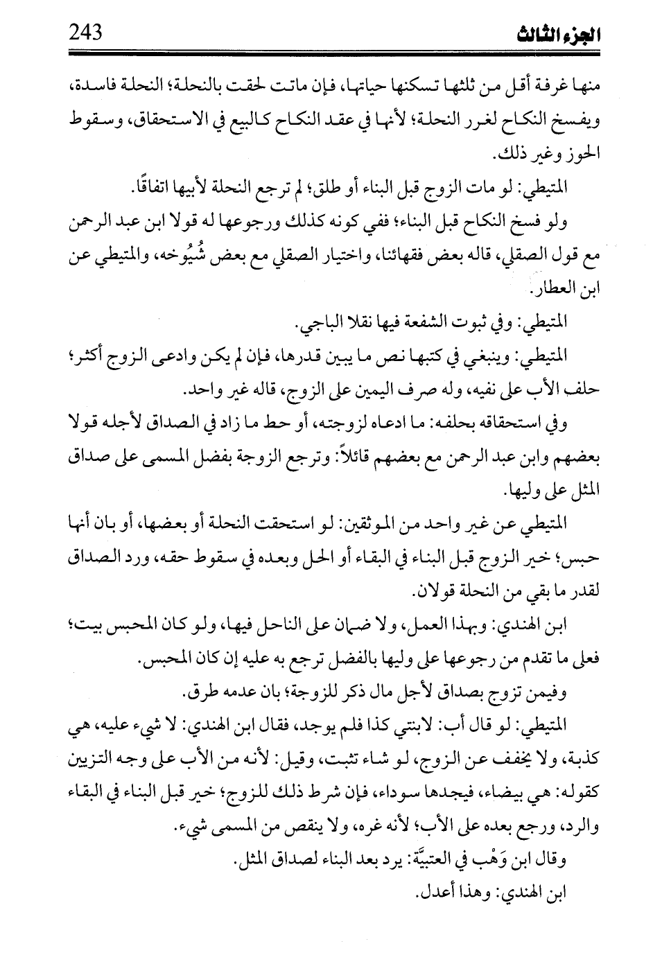 المتيطي: لو مات الزوج قبل البناء أو طلق؛ لم ترجع النحلة لأبيها اتفاقاً.