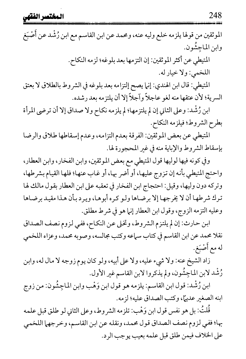 ابن حارث: إن لم يلتزم الشروط، وتخلى عن النكاح، ففي لزوم نصف الصداق نقلاً محمد عن ابن القاسم في كتاب سماعه وكتب مجالسه، وصوبه محمد، وعزاه اللخمي له مع أَصْبَغ.