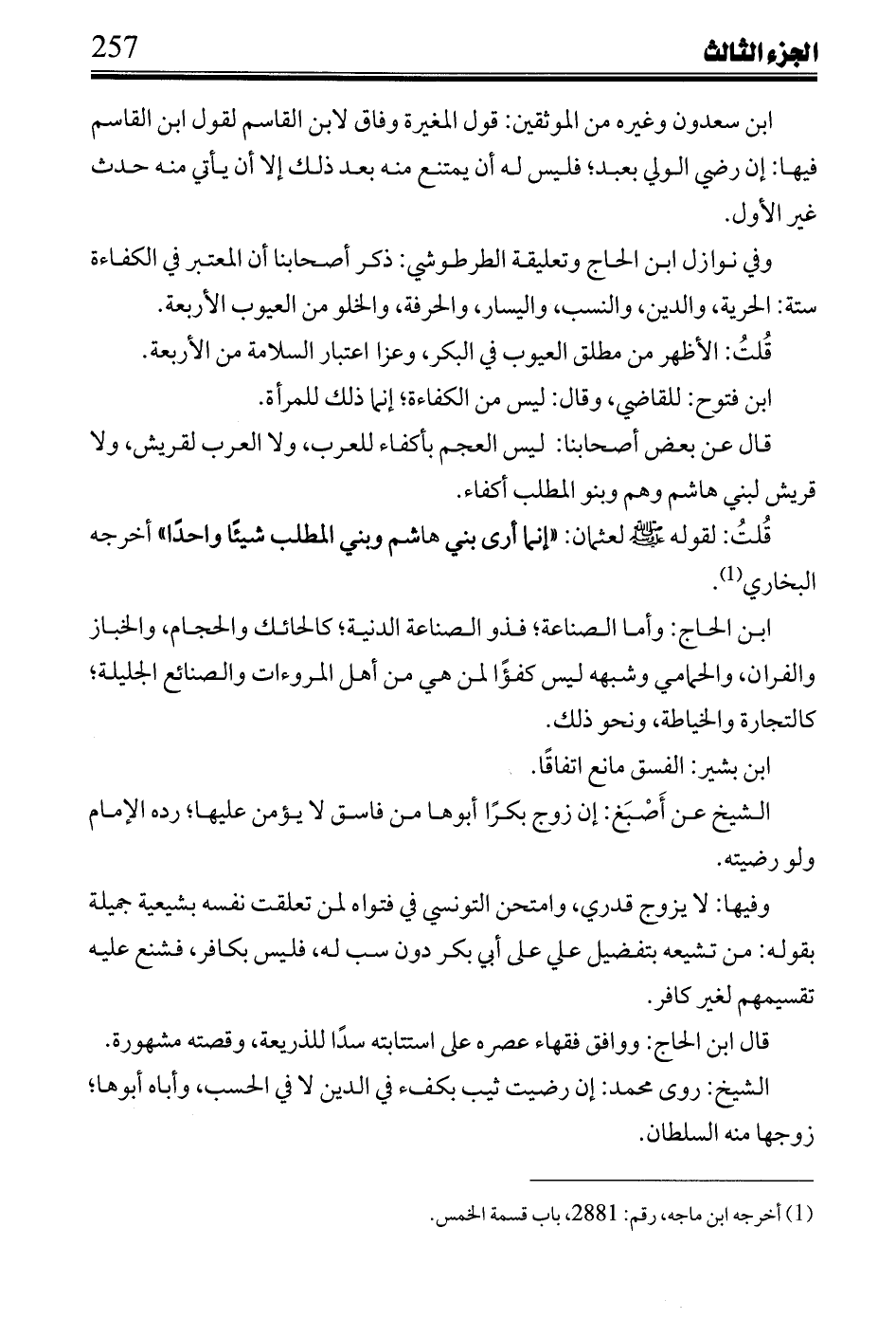 قال عن بعض أصحابنا: ليس العجم بأكفاء للعرب، ولا العرب لقريش، ولا قريش لبني هاشم وهم وبنو المطلب أكفاء.