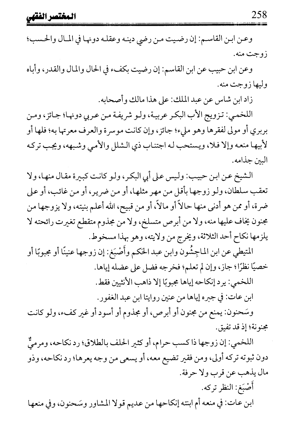 الشيخ عن ابن حبيب: وليس على أبي البكر، ولو كانت كبيرة مقال منها، ولا تعقب سلطان، ولو زوجها بأقل من مهر مثلها، أو من ضرير، أو من غائب، أو على ضرة، أو ممن هو أدنى منها حالاً أو مالا، أو من قبيح، الله أعلم بنيته، ولا يزوجها من مجنون يخاف عليها منه، ولا من أبرص متسلخ، ولا من مجذوم متقطع تغيرت رائحته لا يلزمها نكاح أحد الثلاثة، ويخرج من ولايته، وهو بهذا مسخو.