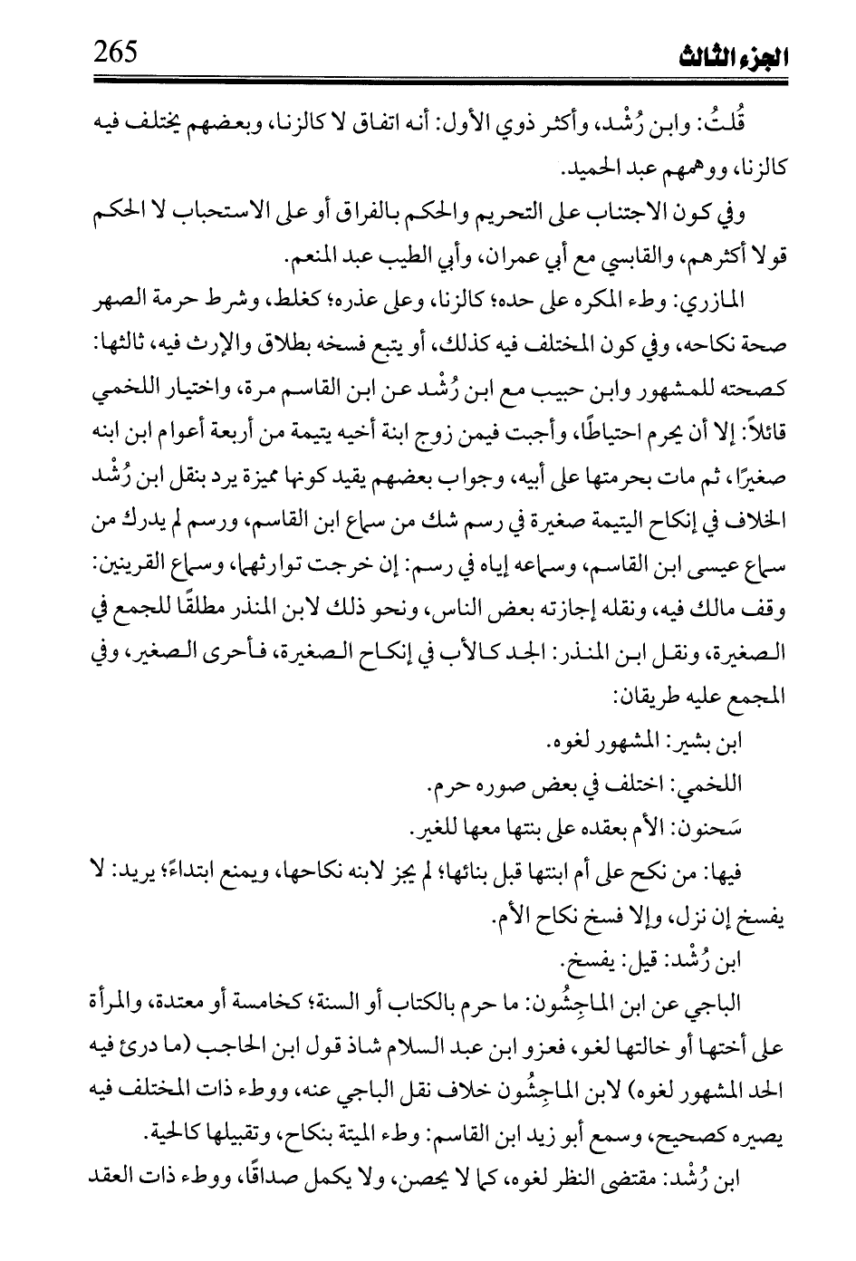 المازري: وطء المكره على حده؛ كالزنا، وعلى عذره؛ كغلط، وشرط حرمة الصهر صحة نكاحه، وفي كون المختلف فيه كذلك، أو يتبع فسخه بطلاق والإرث فيه، ثالثها: كصحته للمشهور وابن حبيب مع ابن رشد عن ابن القاسم مرة، واختيار اللخمي قائلاً: إلا أن يحرم احتياطًا، وأجبت فيمن زوج ابنة أخيه يتيمة من أربعة أعوام ابن ابنه صغيرًا، ثم مات بحرمتها على أبيه، وجواب بعضهم يقيد كونها مميزة يرد بنقل ابن رشد الخلاف في إنكاح اليتيمة صغيرة في رسم شك من سماع ابن القاسم، ورسم لم يدرك من سماع عيسى ابن القاسم، وسماعه إياه في رسم: إن خرجت توارثهما، وسماع القرينين: وقف مالك فيه، ونقله إجازته بعض الناس، ونحو ذلكم لابن المنذر مطلقًأ للجمع في الصغيرة، ونقل ابن المنذر: الجد كالأب في إنكاح الصغيرة، فأحرى الصغير، وفي المجتمع عليه طريقان: