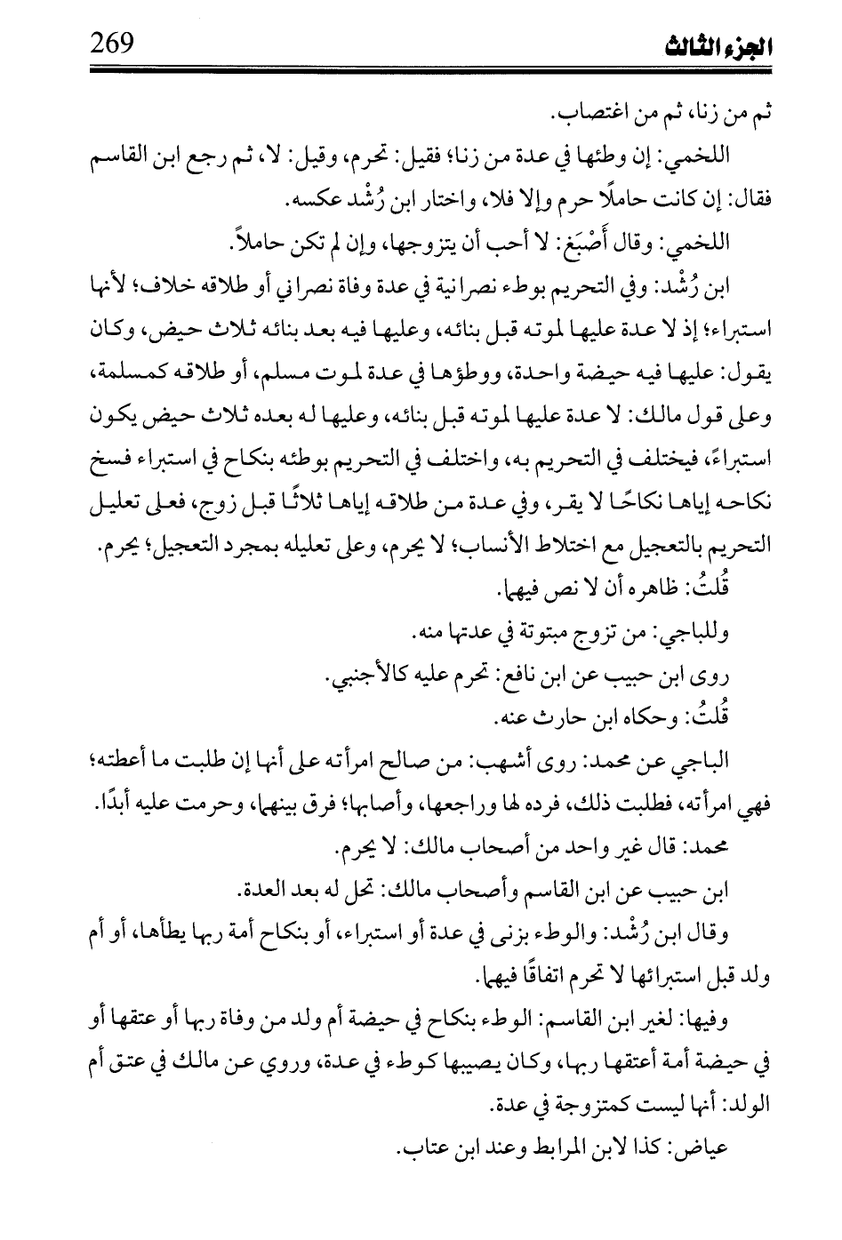 ابن رشد: وفي التحريم بوطء نصرانية في عدة وفاة نصراني أو طلاقه خلاف؛ لأنها استبراء؛ إذ لا عدة عليها لموته قبل بنائه، وعليها فيه بعد بنائه ثلاث حيض، وكان يقول: عليها فيه حيضة واحدة، ووطؤها في عدة لموت مسلم، أو طلاقه كمسلمة، وعلى قول مالك: لا عدة عليها لموته قبل بنائه، وعليها له بعده ثلاث حيض يكون استبراءً، فيختلف في التحريم به، واختلف في التحريم بوطئه بنكاح في استبراء فسخ نكاحه إياها نكاحًا لا يقر، وفي عدة من طلاقه إياها ثلاثًا قبل زوج، فعلى تعليل التحريم بالتعجيل مع اختلاط الأنساب؛ لا يحرم، وعلى تعليله بمجرد التعجيل؛ يحرم.