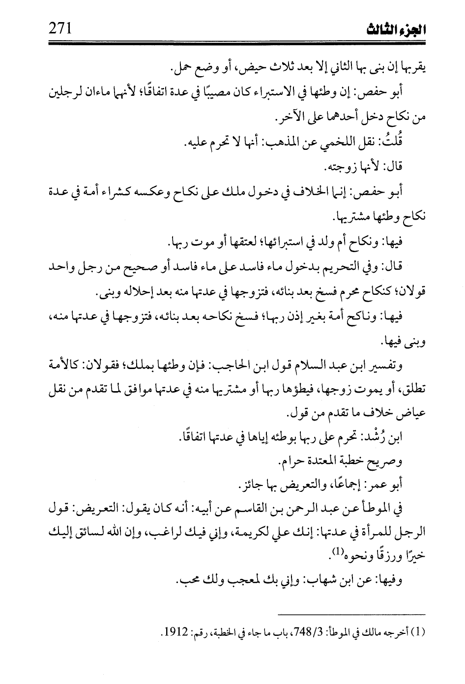 وتفسير ابن عبد السلام قول ابن الحاجب: فإن وطئها بملك؛ فقولان: كالأمة تطلق، أو يموت زوجه، فيطؤها ربها أو مشتريها منه في عدتها موافق لما تقدم من نقل عياض خلاف ما تقدم من قول.
