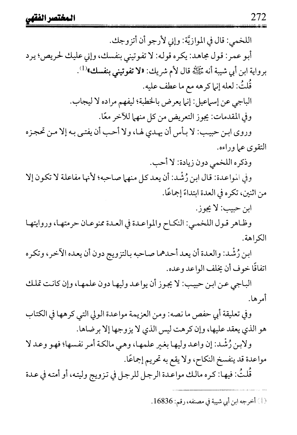 قلتُ: فيها: كره مالك مواعدة الرجل للرجل في تزويج وليته، أو أمته في عدة